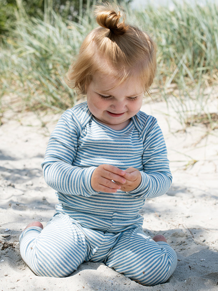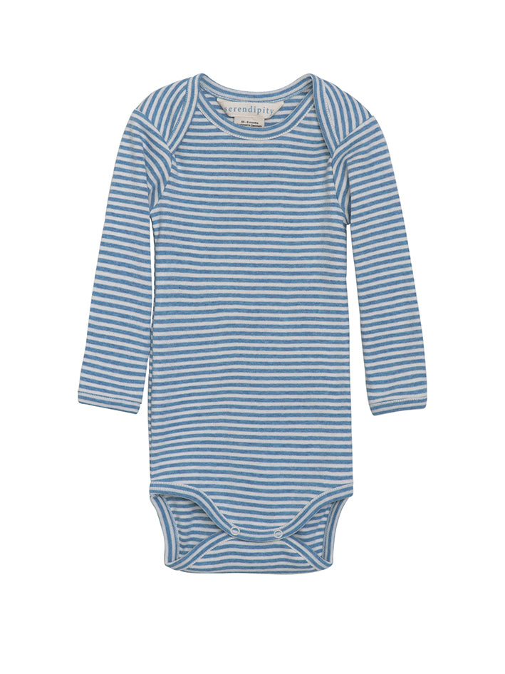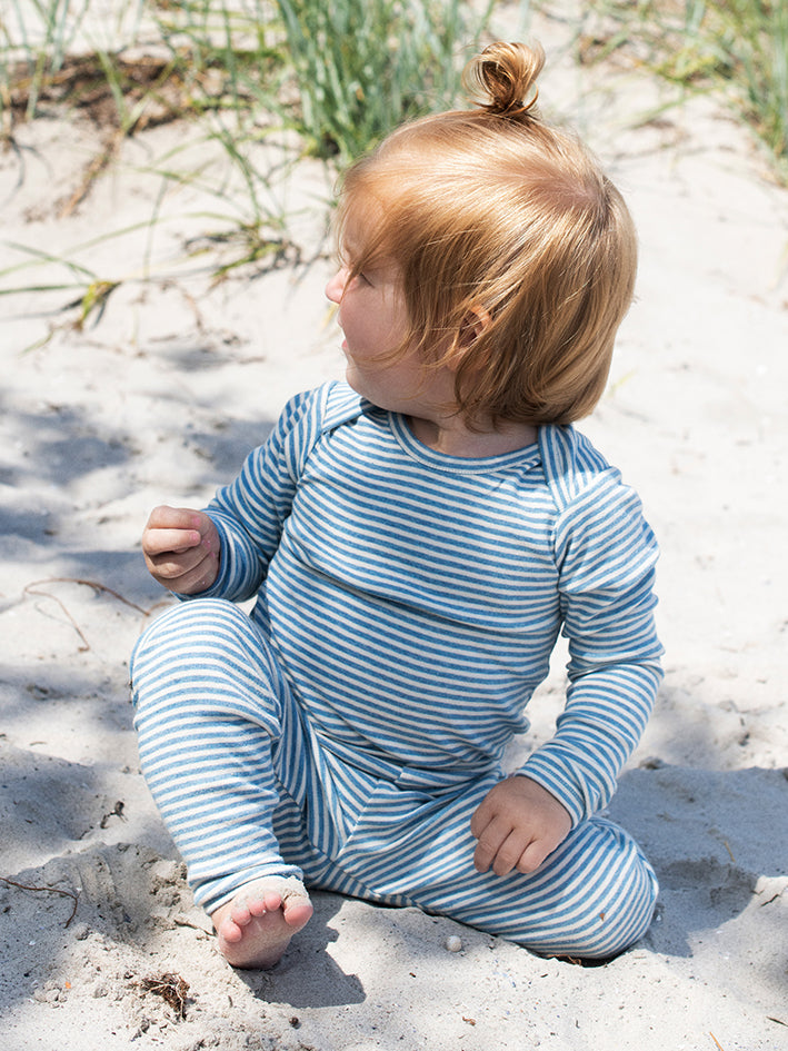Classic Serendipity Striped Body stocking in Azur blue and Off-white. Softest quality of 100% organic cotton and design with envelope closing by shoulders. Push buttons by legs. GOTS certified.