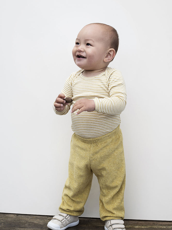 Baby Body in soft Melange Rib in pure organic cotton. Classic Serendipity Stripes in Chamomille and Offwhite. Snap buttons in crotch and envelope shoulder finish for easy dressing.