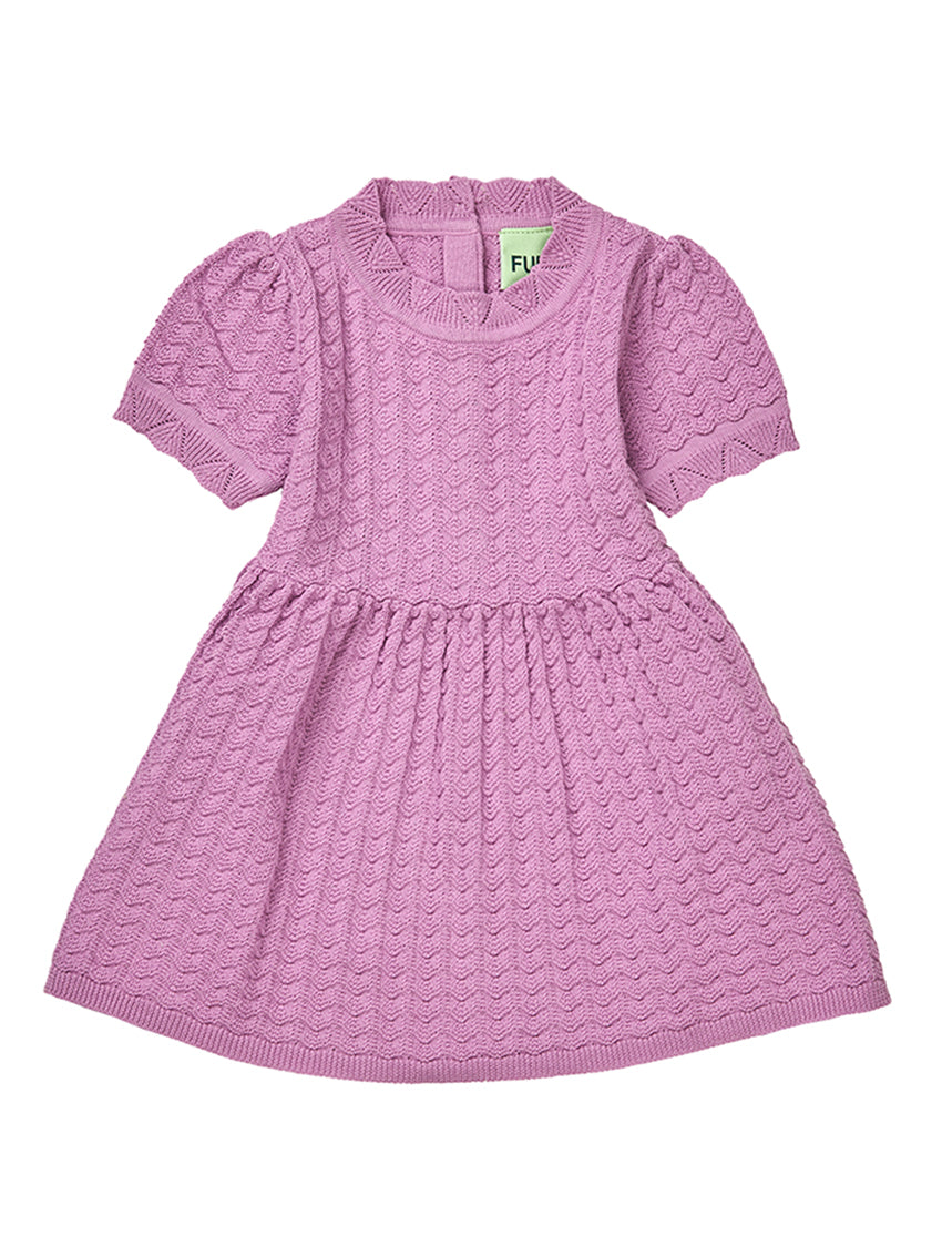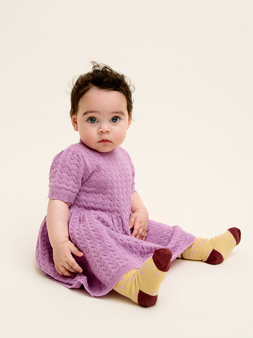 Made from organic cotton, this Baby Dress in Orchid by Fub features short puff sleeves, pointelle lace details at sleeve hem and neckline and a practical button closure at the back with pearl shell buttons. The dress is knitted in a firm pointelle pattern and has soft gatherings at the waist to create volume to the bottom of the skirt. 100% certified organic cotton