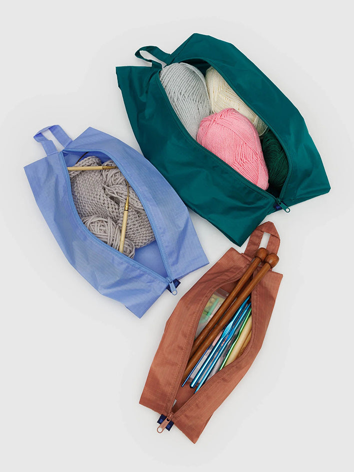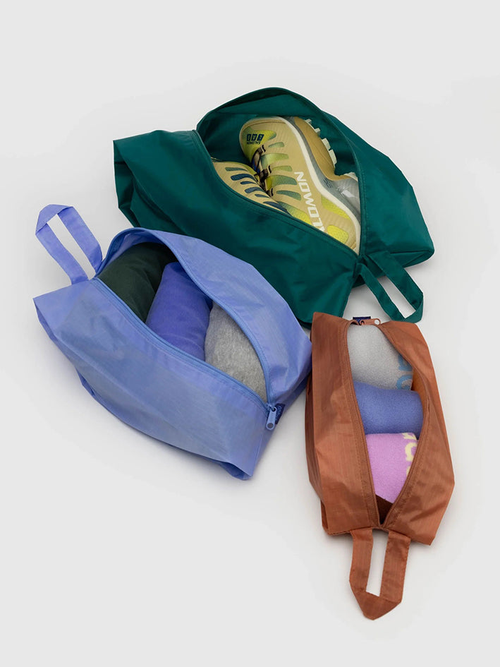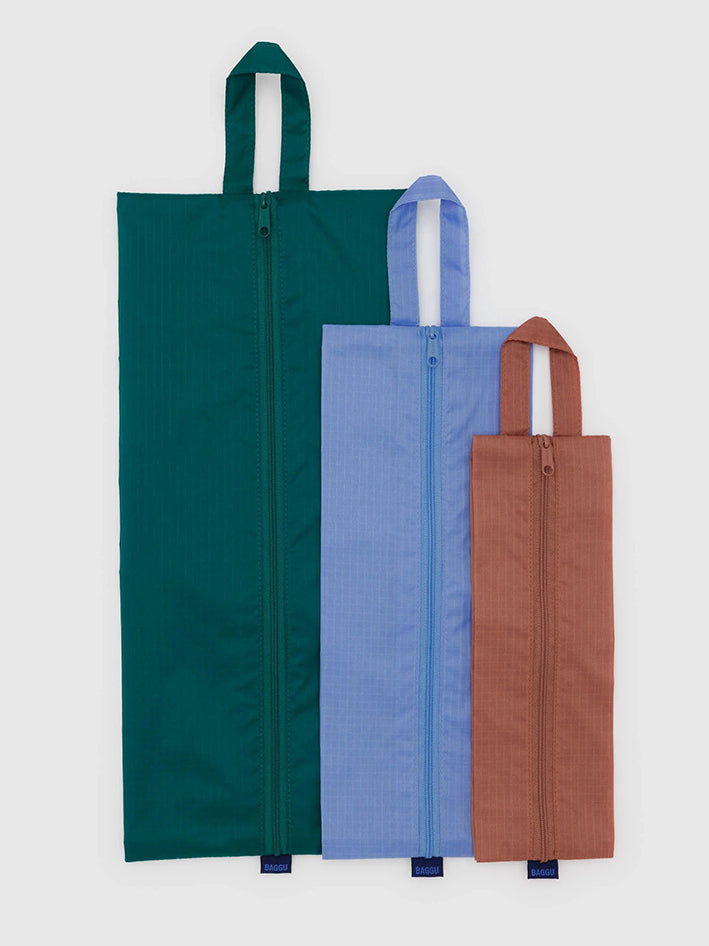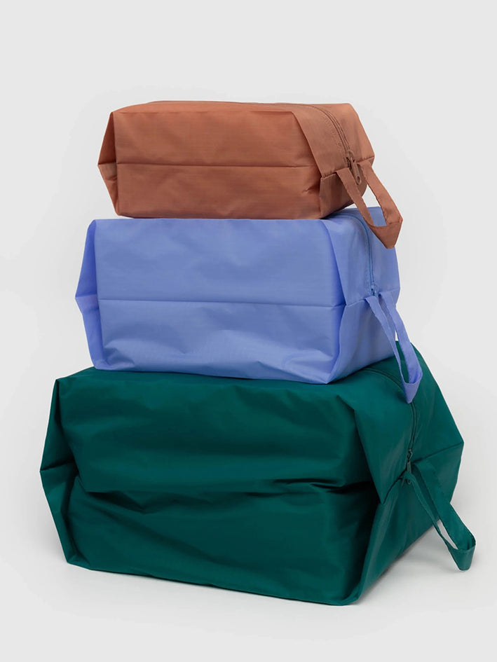 A Baggu Set of three Zippered Pouches in Canyon for travel and organization, with loops for carrying and hanging on the go. Perfect for packing, organizing your bag, or home tidying. Measurements Large expands to 10" × 7" × 6 ½" Medium expands to 8 ½" × 5" × 5" Small expands to 7" × 3 ½" × 3 ½" Recycled ripstop nylon Machine washable