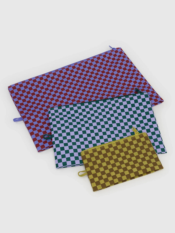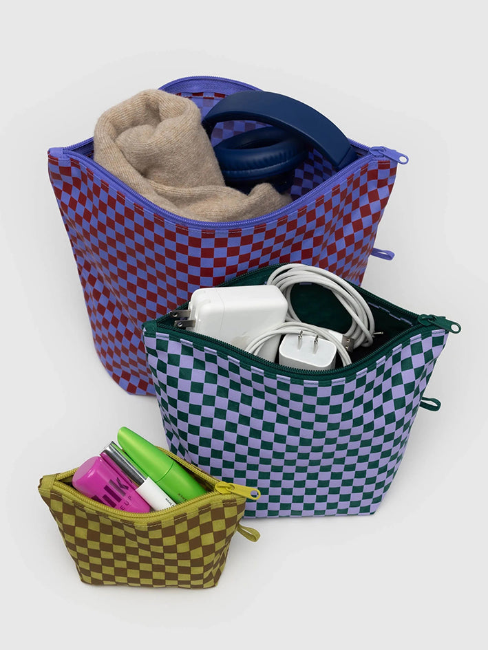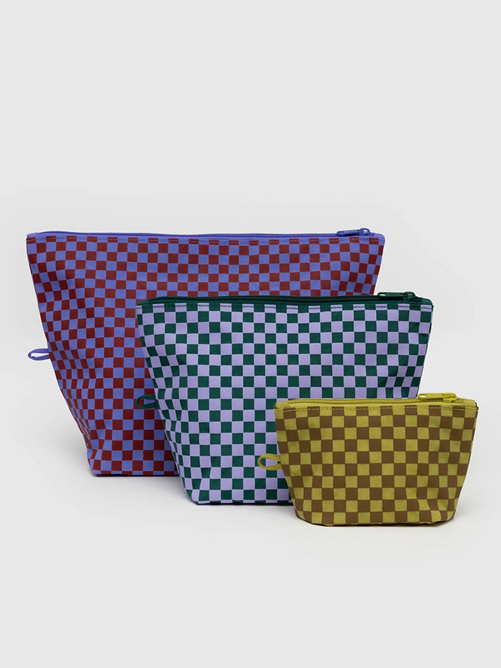 The Baggu Go Pouch Set in Jewel Checks makes it easy to keep your bag neatly packed and organized. Whatever you're toting—coins, cords, or an extra pair of shoes—this set of three all purpose pouches keeps it together. They expand to hold your essentials and lay flat when not in use.