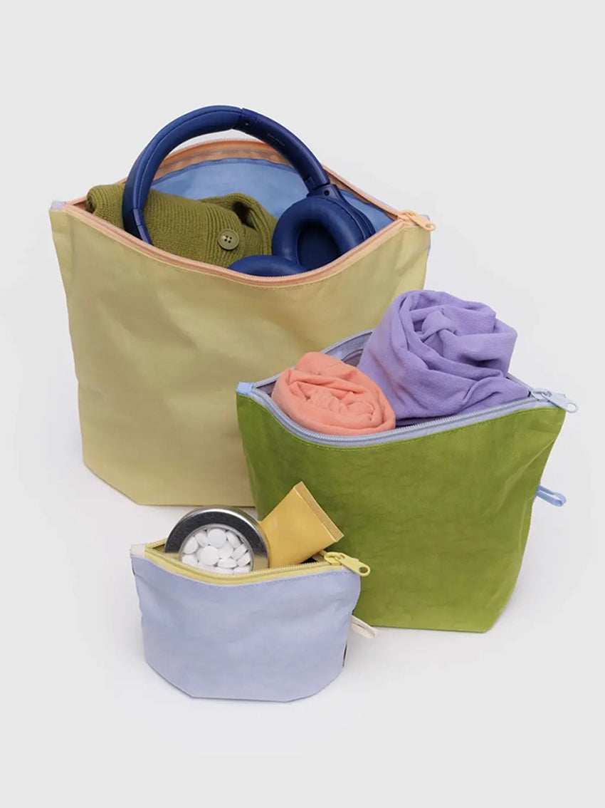 The Baggu Go Pouch Set in Pastels Colorblock makes it easy to keep your bag neatly packed and organized. Whatever you're toting - coins, cords, or an extra pair of shoes - this set of three all-purpose pouches keeps it together. They expand to hold your essentials and lay flat when not in use.