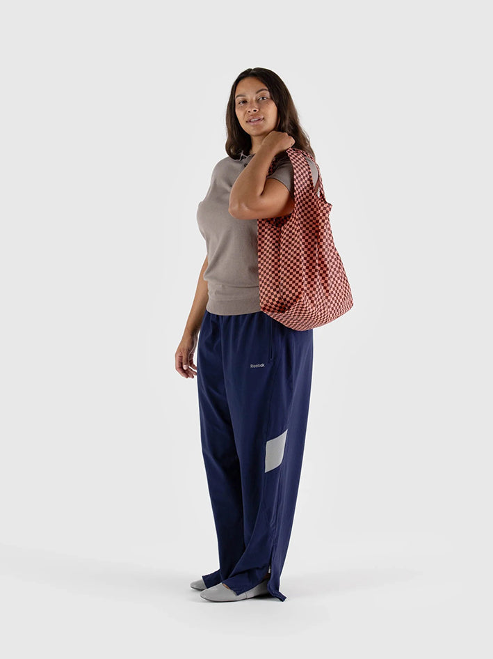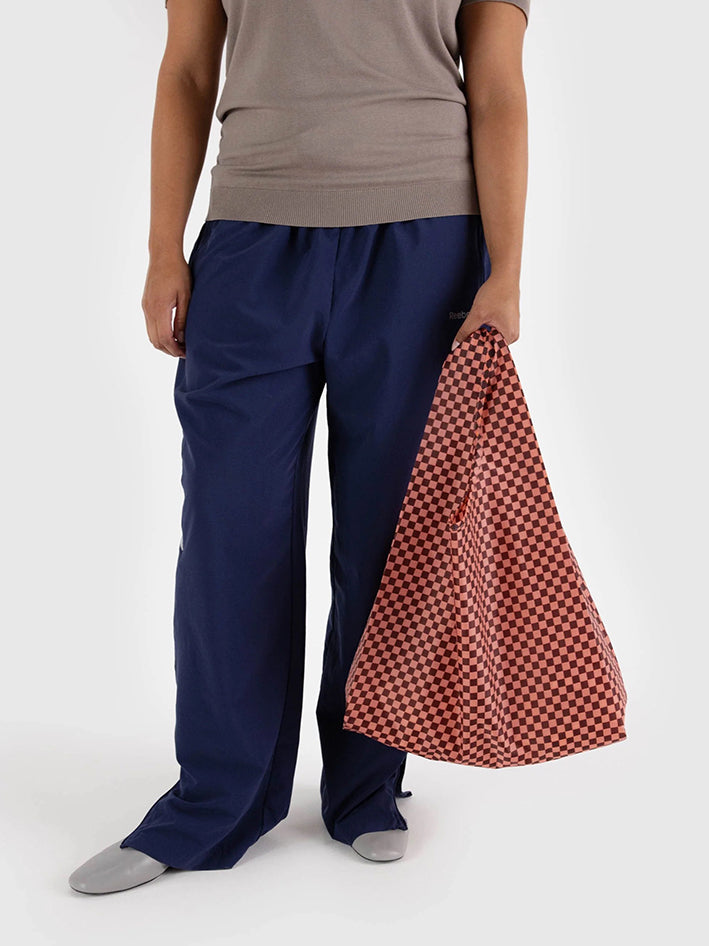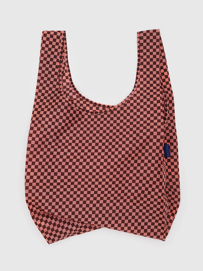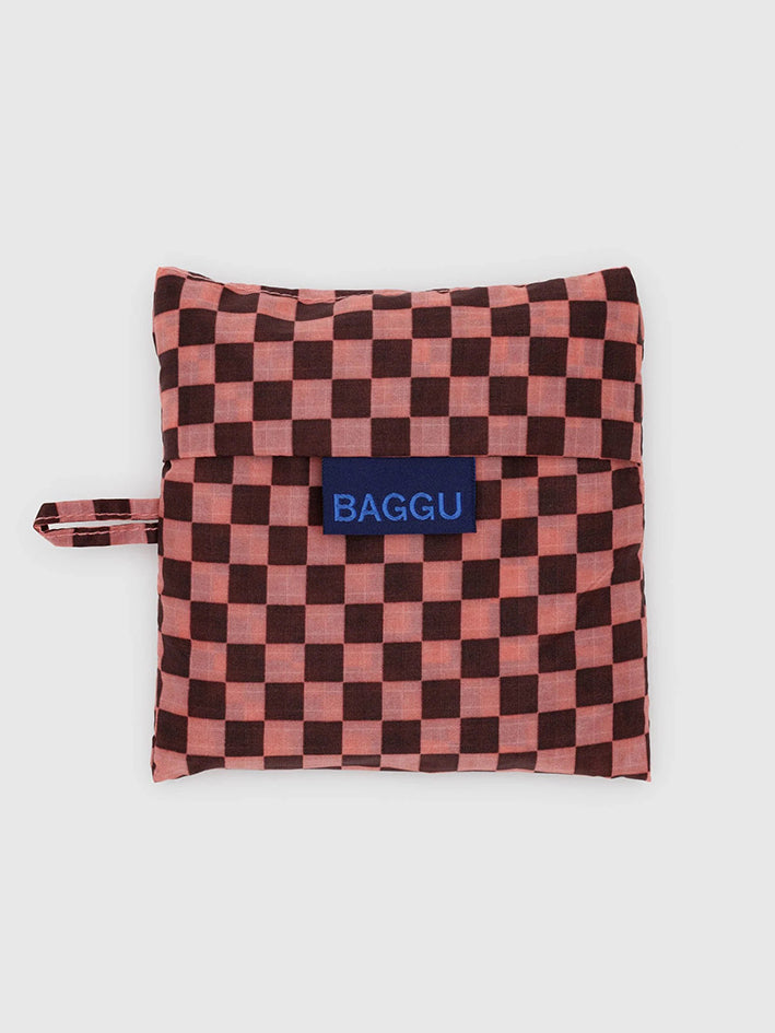 The best selling reusable Baggu Bag in Pink Brown Check isn't just for the grocery store, it goes everywhere and hauls almost anything. Carries 2-3 plastic grocery bags worth of stuff comfortably in hand or over your shoulder Holds up to 50lbs Folds into its own flat 5" × 5" pouch Measures 25 ½" × 15 ½" × 6" Recycled ripstop nylon Machine washable