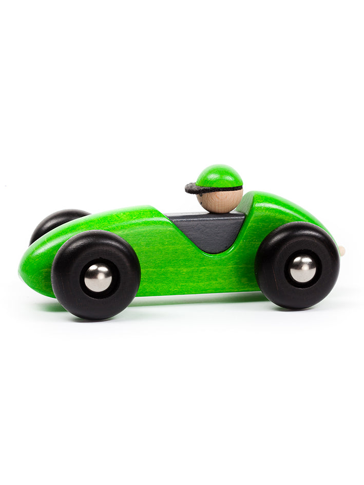 Bajo Left and Right Car in Green Thanks to its clever construction, this ingenious car has the fluid ability to turn in either direction. Beautifully crafted from solid wood, it proudly boasts unique retro styling and is sure to be a favourite with your child. Perfect for taking on high speed corners at the race track or a drive through the countryside. Only carefully selected high quality materials from certified local suppliers, who respect European eco-standards of wood production have been used. Produced with certified non-toxic paints based on natural components, which fulfil EU safety standard (EN71) and US norms. A range of water based paints as well as oils are used to protect the wood. Size: 16 x 8 x 7 cm