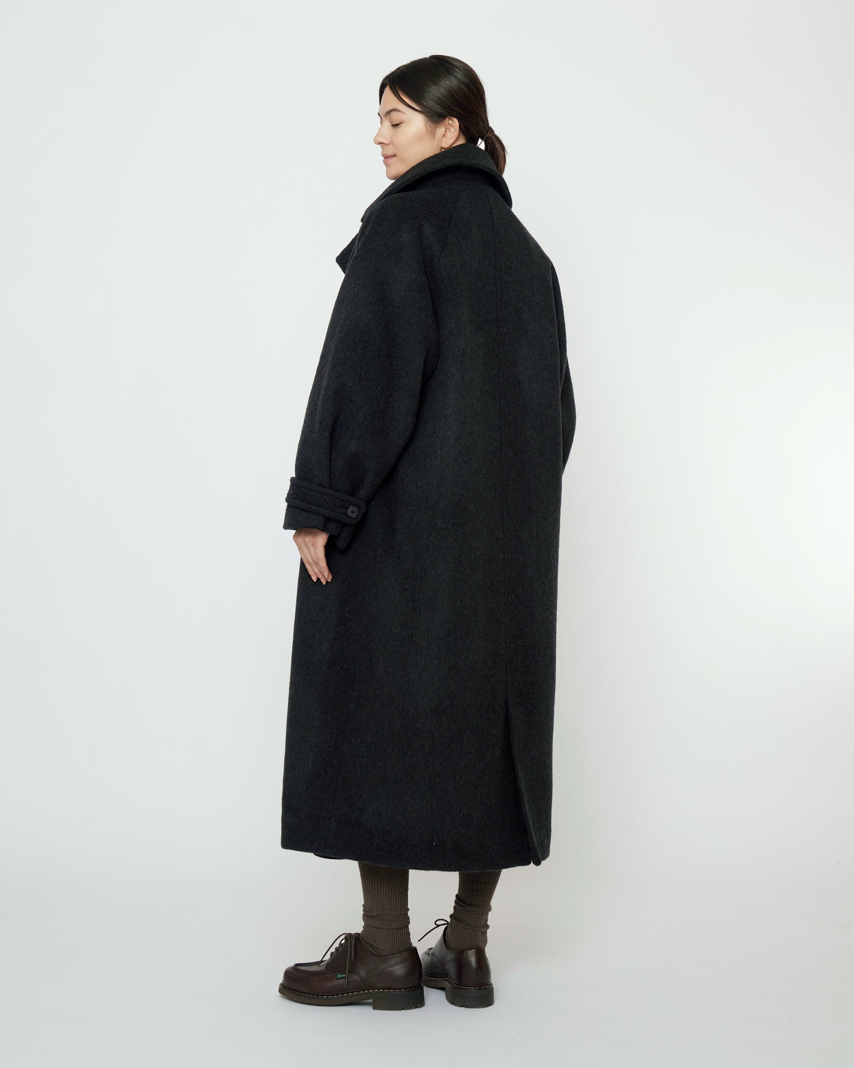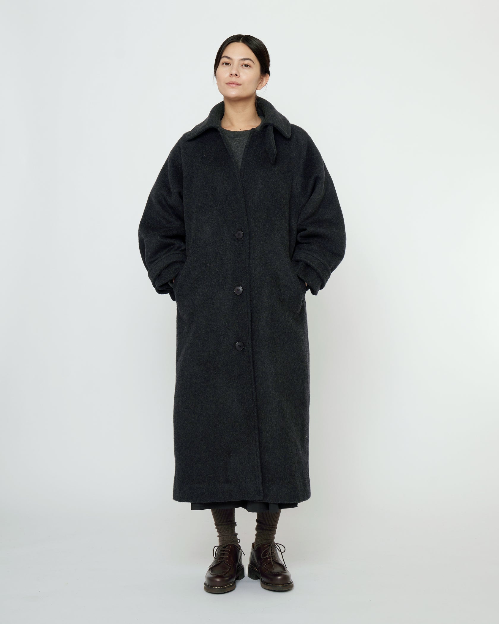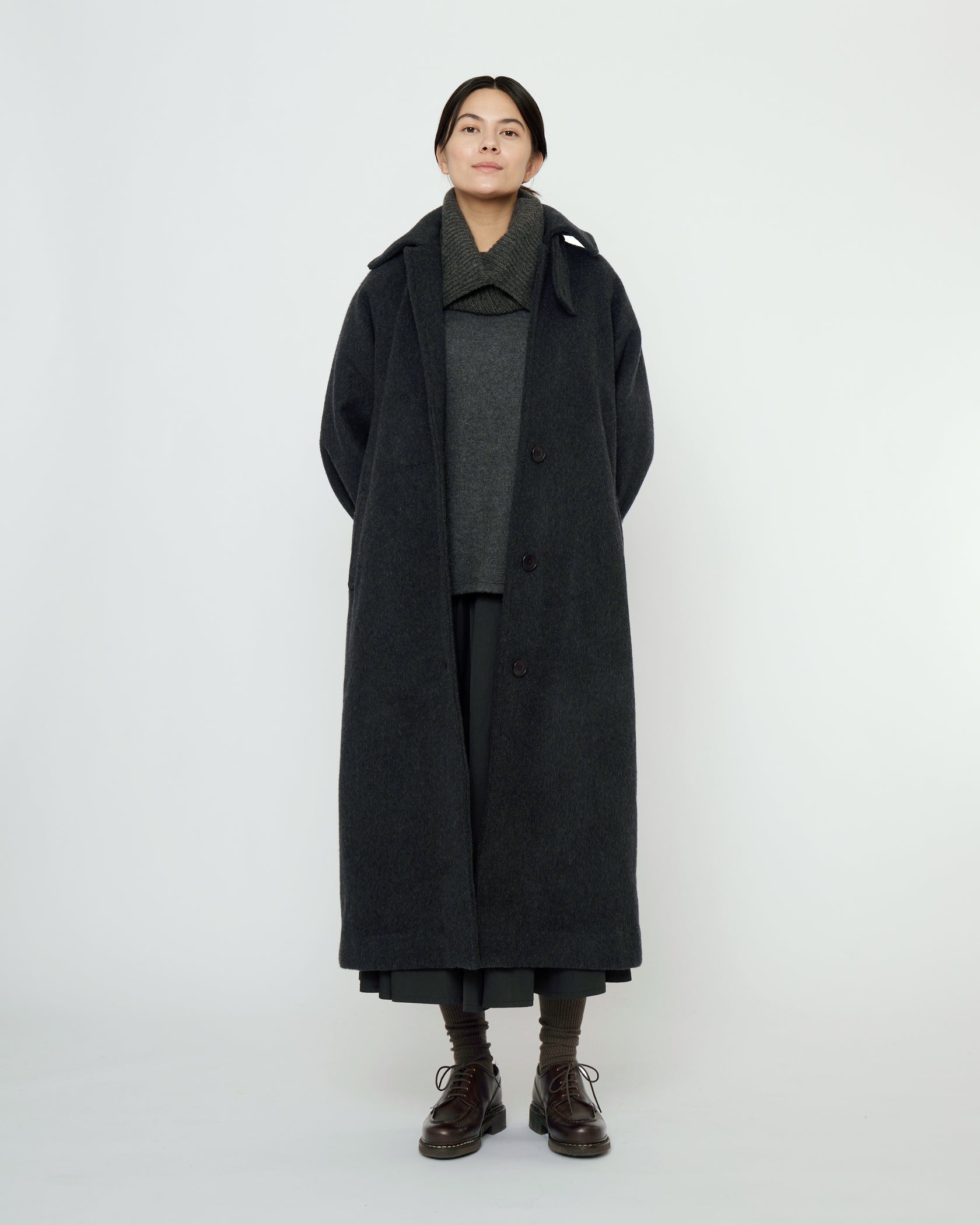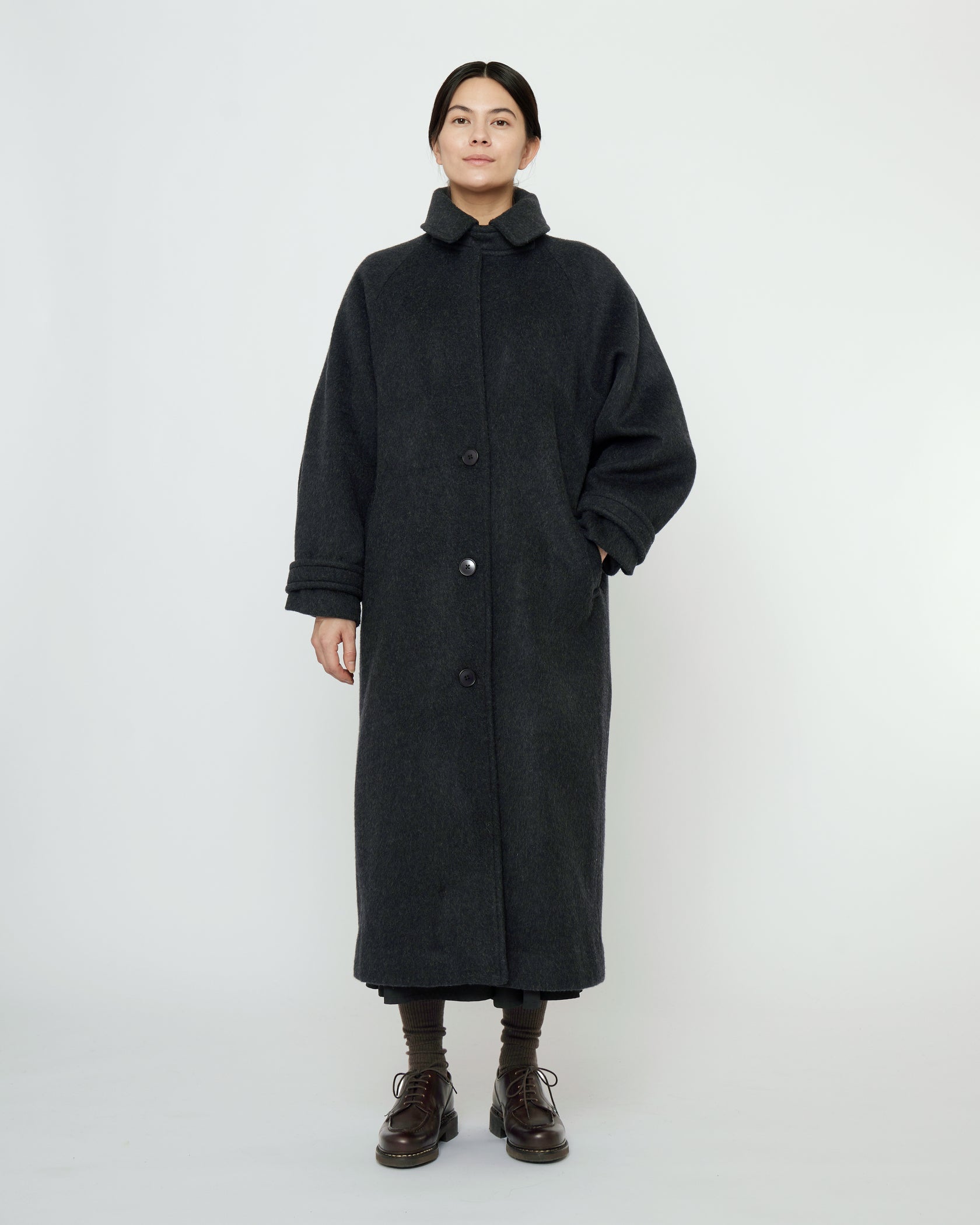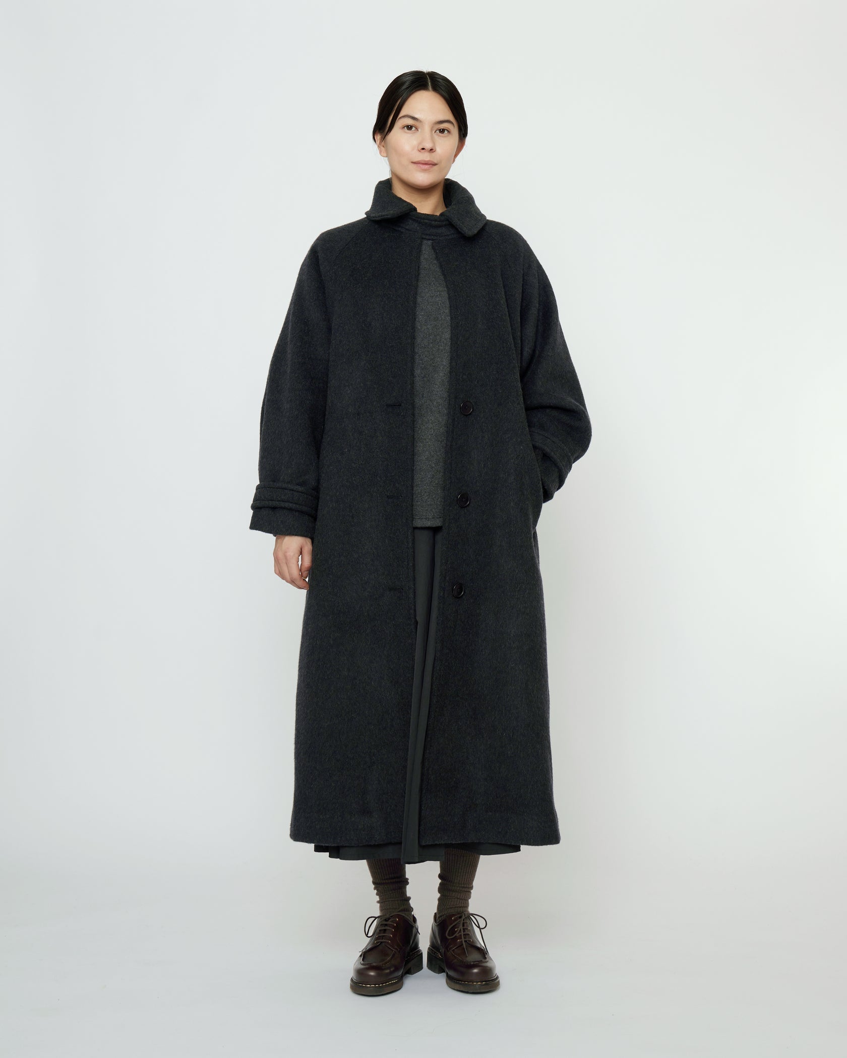 A classically tailored and enduring balmacaan coat. A full length, fully lined single-breasted coat with raglan sleeves, slash pockets, and a prussian collar.