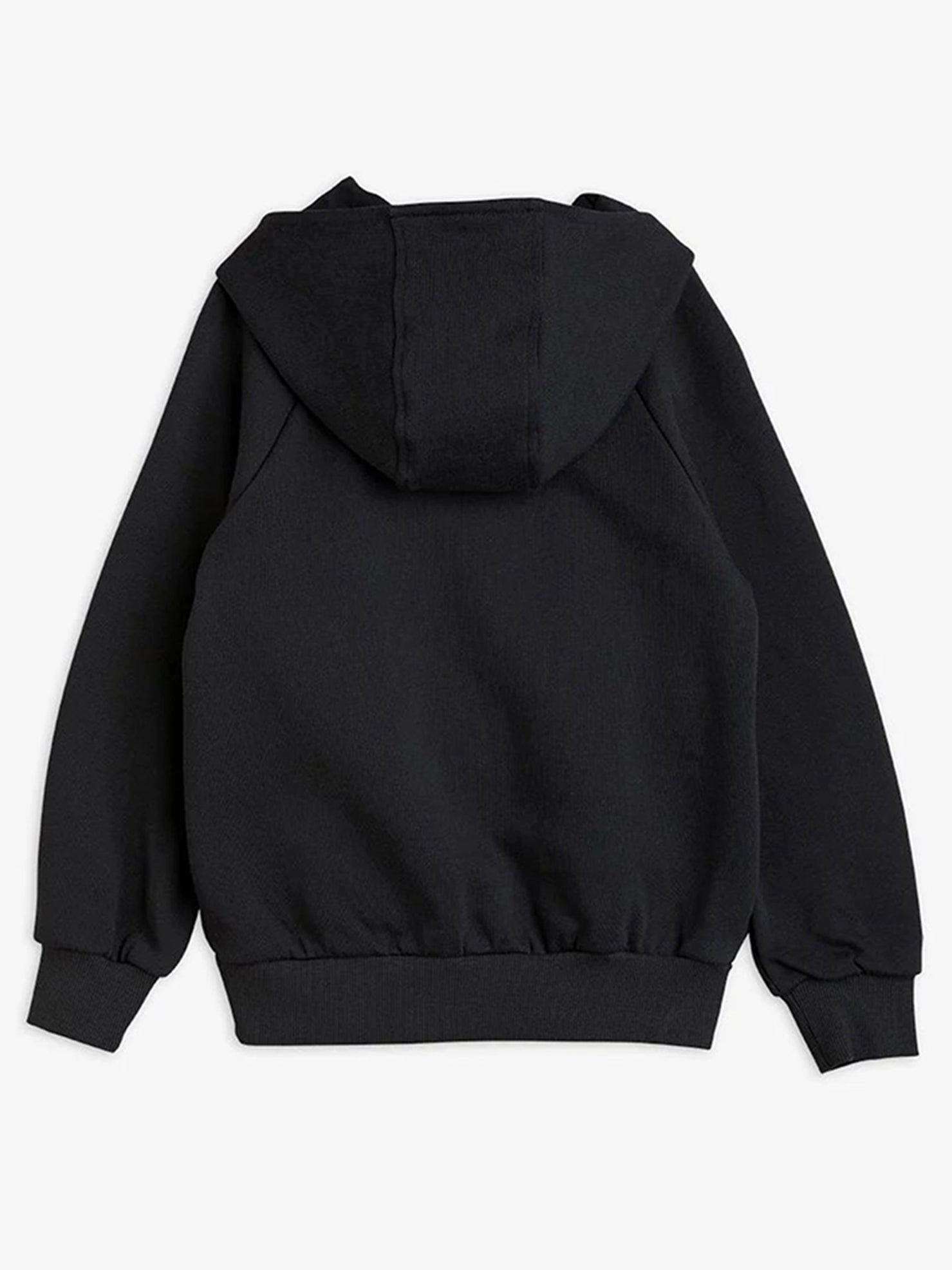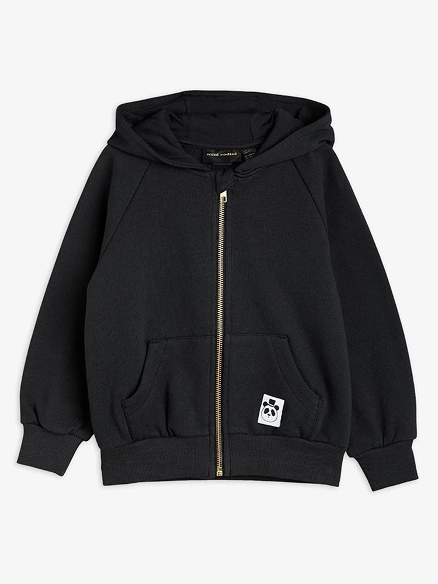 The hoodie is designed with a Mini Rodini Panda label, a golden metal zipper, raglan sleeves, two pockets in the front as well as ribbed cuffs and bottom hem.