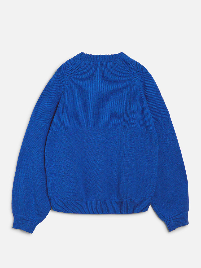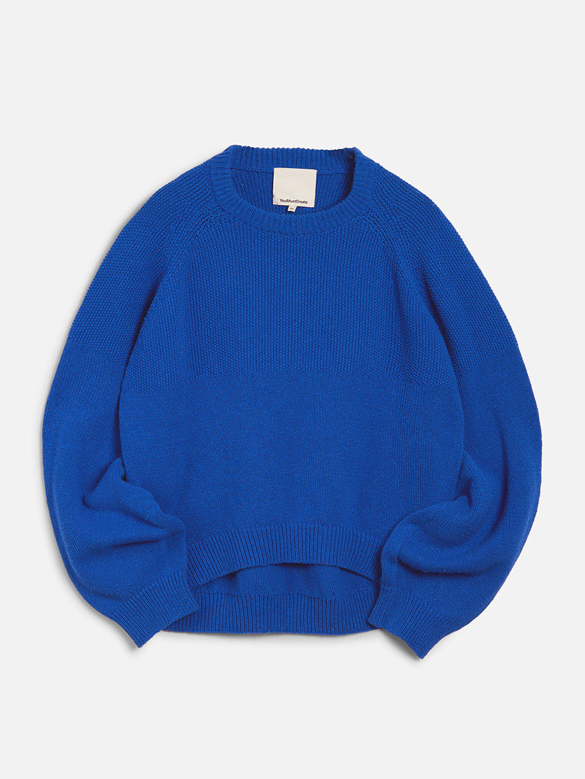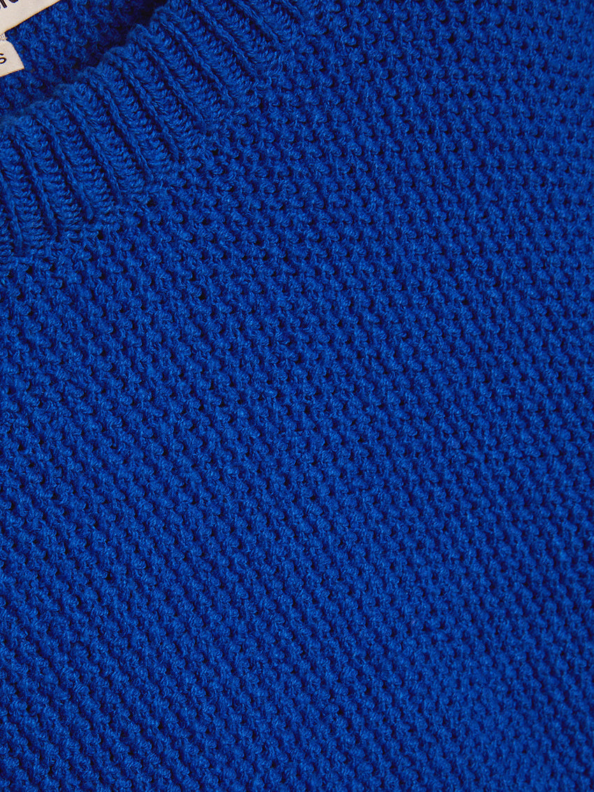 Knitted crew neck jumper made from recycled cotton blend yarn.