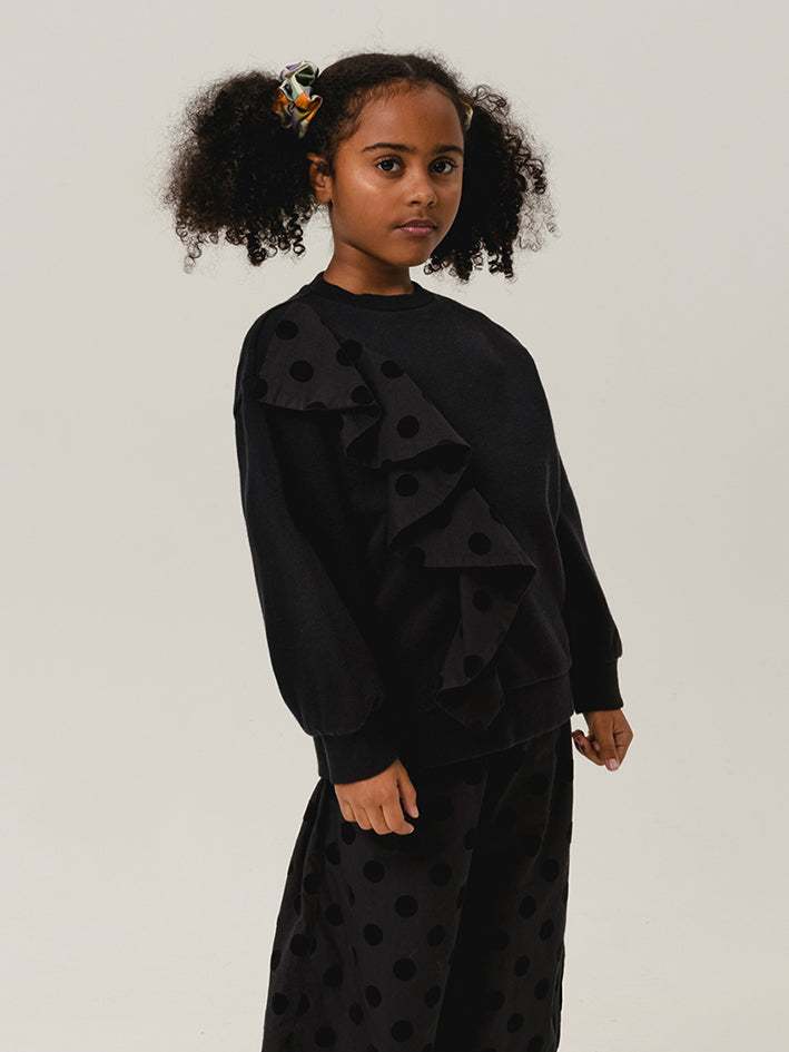 Wolf & Rita Bernadete Jumper Dunkel is a soft cotton sweatshirt with a striking frill detail from shoulder to chest.