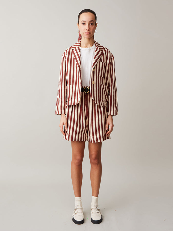 The Bernay Jacket is an oversized and cropped jacket with three front patch pockets, two at the hip and one chest pocket.