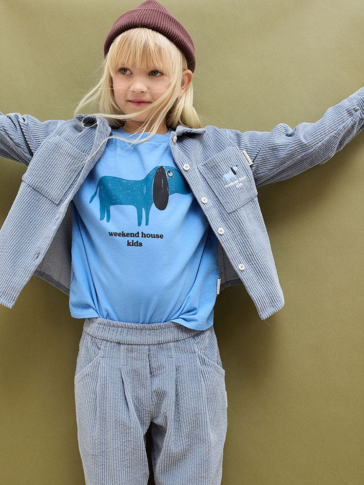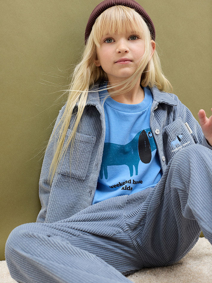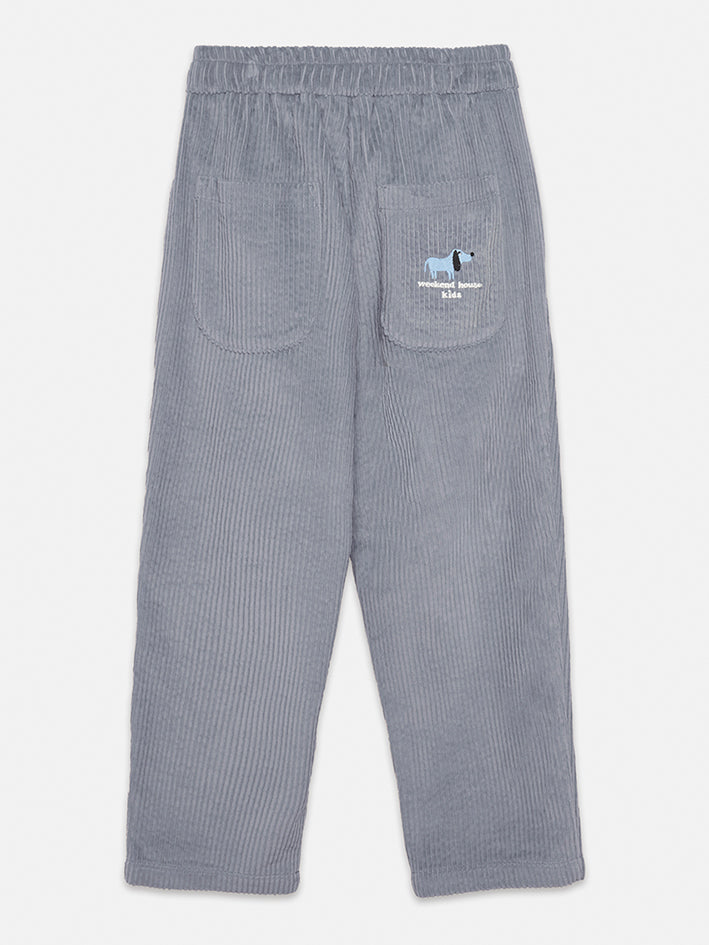 Weekend House Kids Blue Dog Corduroy Pants Blue comfort meets style in these carrot fit pants made from soft organic cotton.