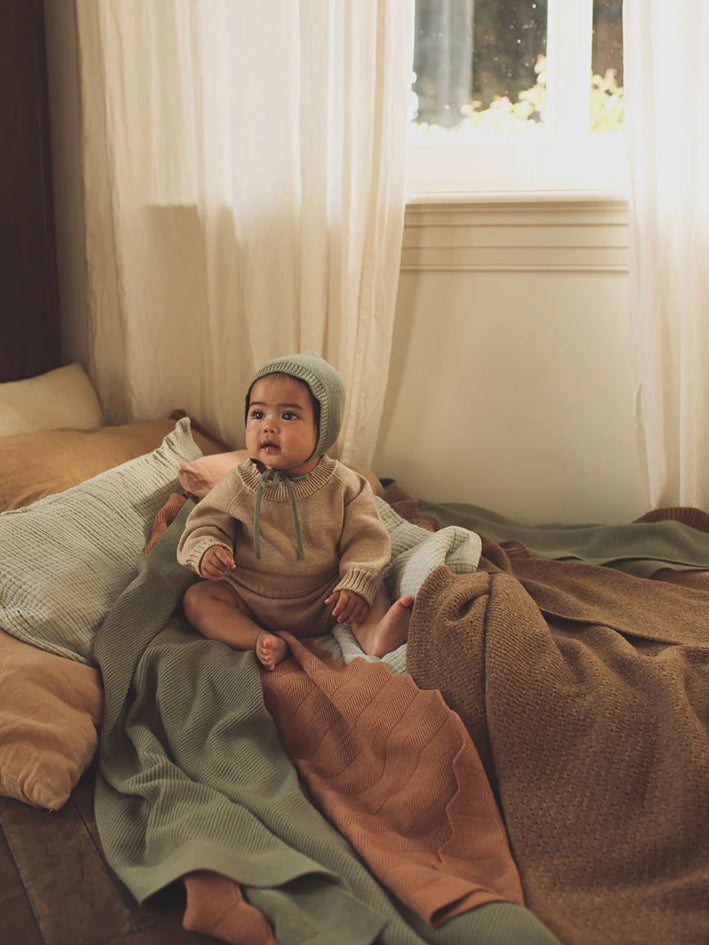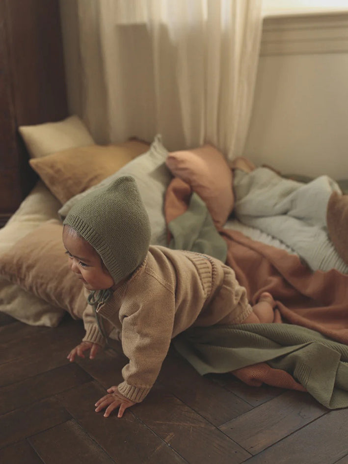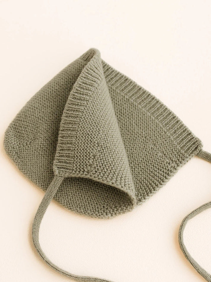 Hvid soft, seamless knitted Bonnet Dolly in Artichote is made from 100% extra fine Italian merino wool, providing both warmth and comfort for babies. Medium-thick, it’s perfect for wearing both indoors and outdoors, helping to regulate your baby’s temperature. The bonnet is secured with a ribbon, ensuring a snug and comfortable fit on the baby’s head.