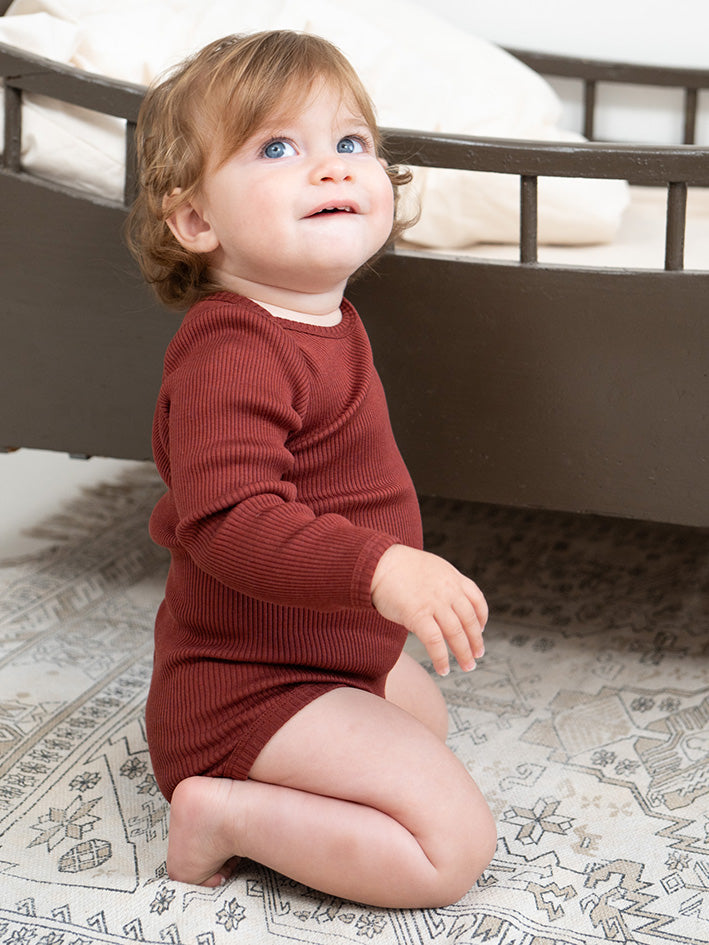 The seamless long-sleeve Bono Body in Hibiscus from Minimalisma is crafted in a soft silk-cotton blend. The body features an envelope neck opening and YKK nickel-free snap buttons for easy dressing and convenience. Silk is known for its hypoallergenic properties and gentle touch against the skin. This, combined with the seamless construction of the garment, makes this body an excellent choice for kids with sensitive skin. Quality: 70% Silk, 30% Cotton