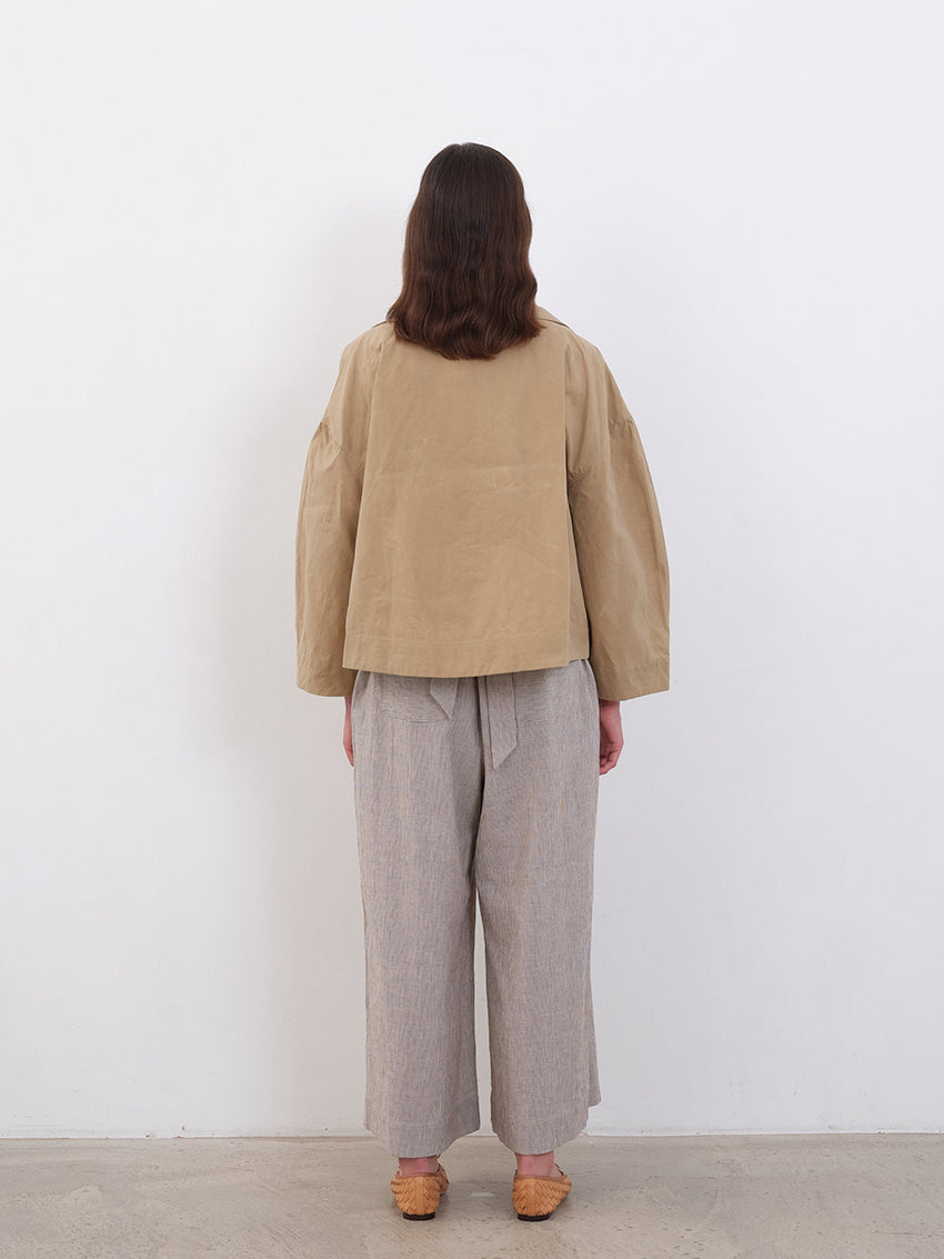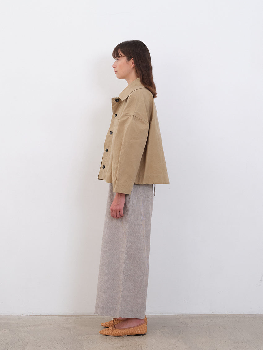 Workwear-inspired touches include buttoned waist tabs to create more defined volume and practical side seam pockets.