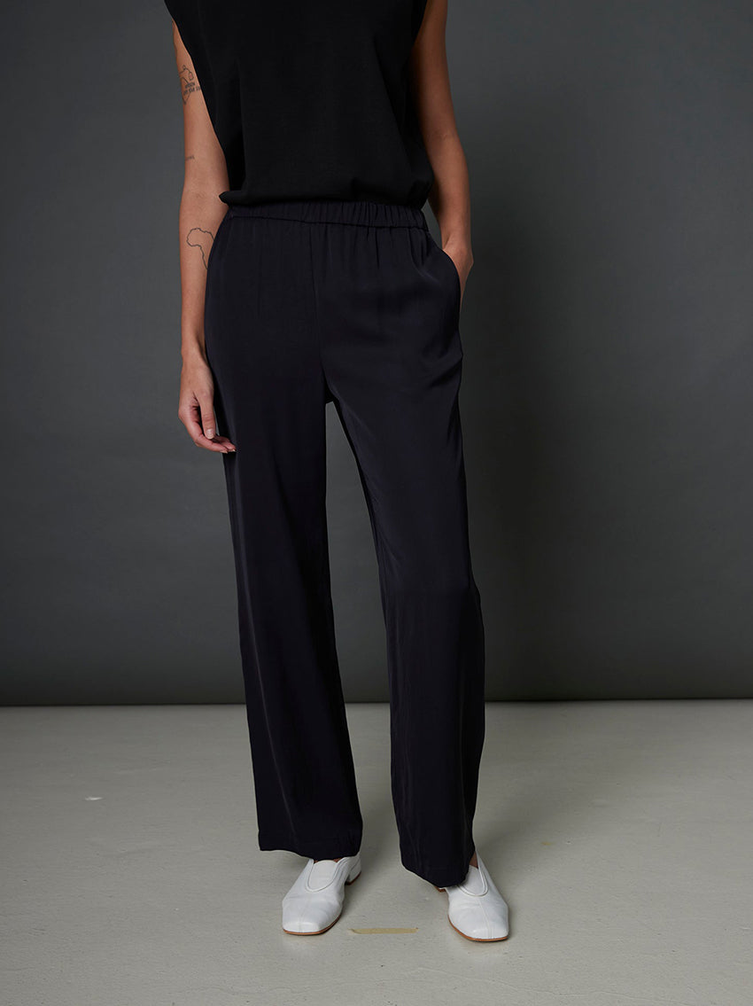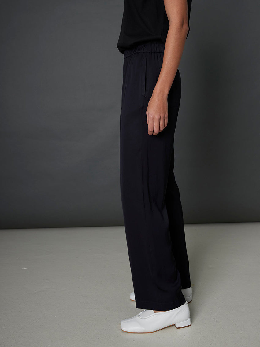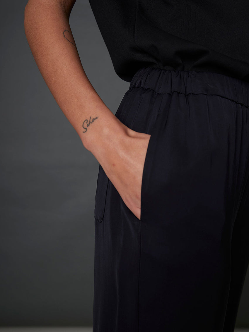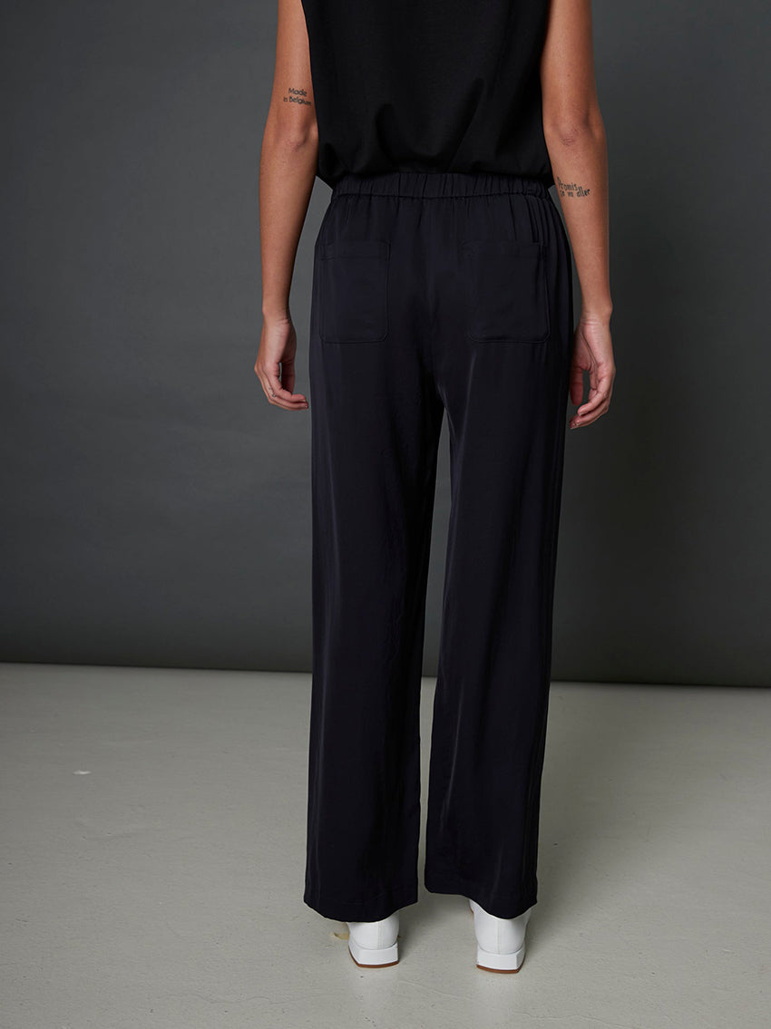 These Buri Trousers by Rue Blanche are made from Navy blue, evening-wear viscose that drapes elegantly around the body. They feature a straight fit, mid-rise waist, and ankle length, with side seam and back patch pockets. The elasticated waist ensures comfort while maintaining a sleek, refined silhouette. Details - Straight fit - Ankle length - Mid-rise waist - Side seam pockets - Back patch pockets - Elasticated waist - Made in Bulgaria Composition 98% Viscose 2% Elastane