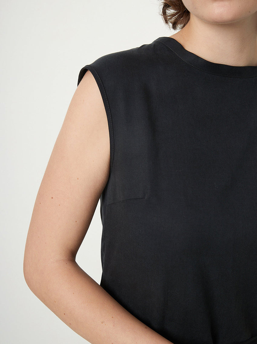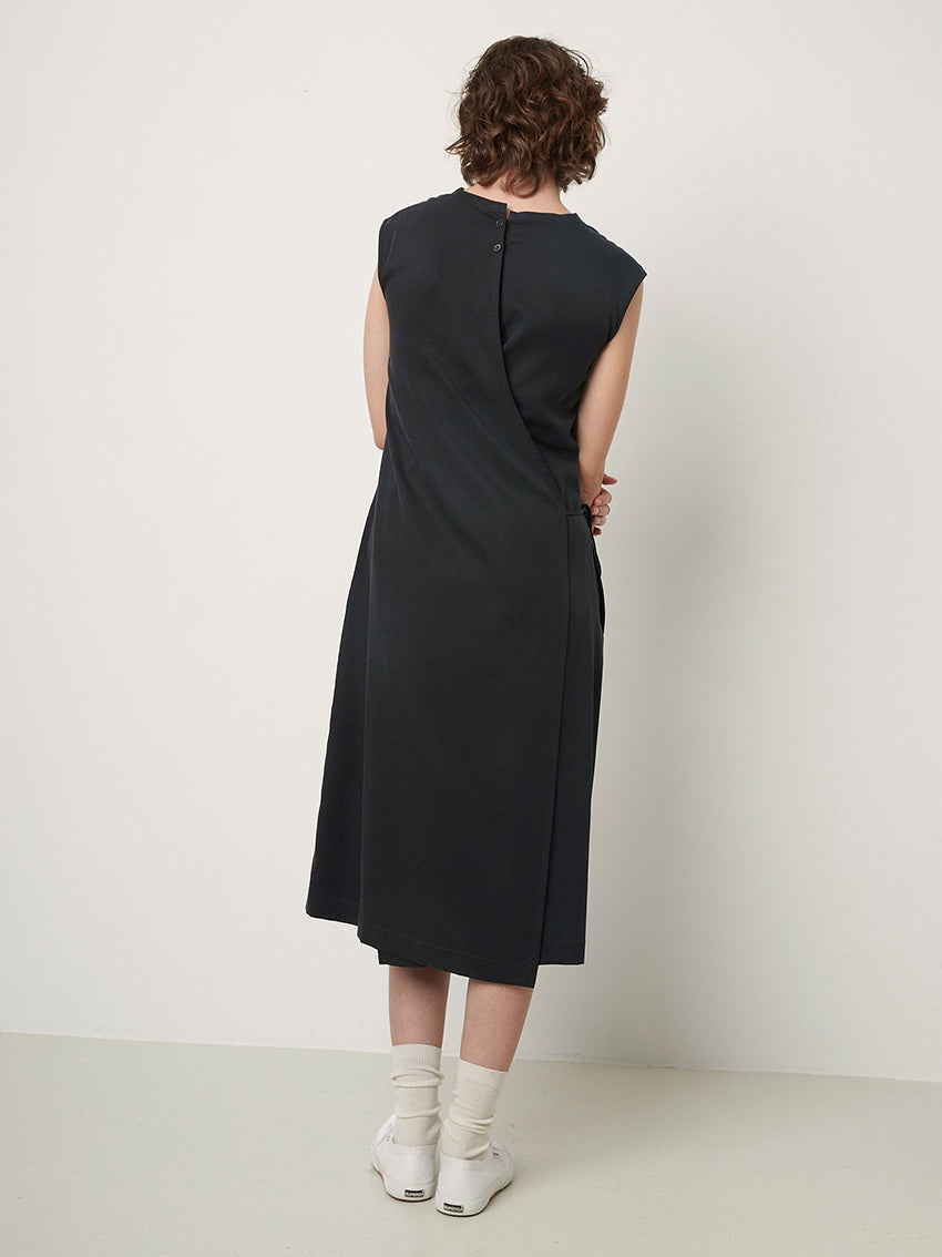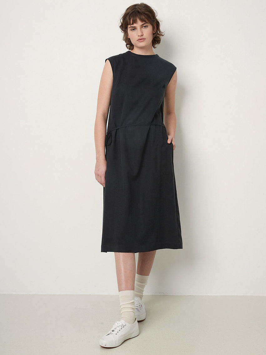 This Carry Dress by Rue Blanche is made from a tencel-cotton blend in dusty off-black, offering a fluid drape and a soft feel. It features a sleeveless design, midi length, and round neck, with a flattering back cache-coeur style. The straight fit, fine belt, and side seam pockets add both elegance and practicality. Details - Sleeveless - Midi length - Round neck - Back cache-coeur style - Straight with fine belt - Side seam pockets - Made in Romania Composition 89% Tencel 11% Cotton