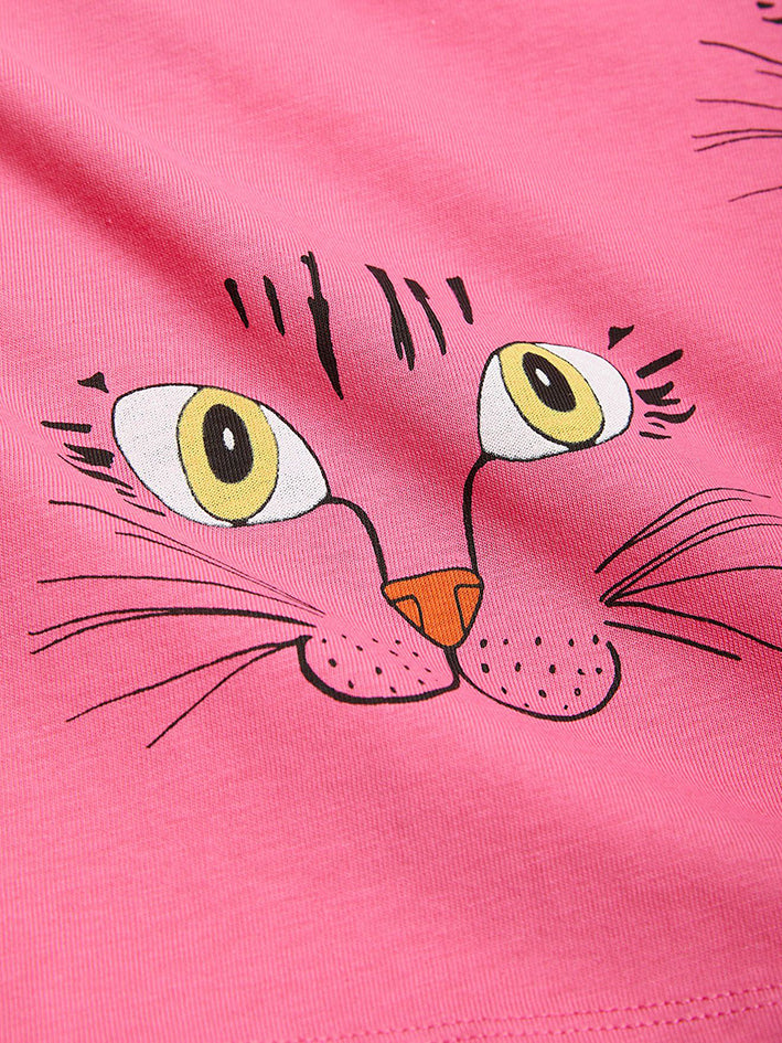 Mini Rodini Pink relaxed fit LongsleeveT-Shirt with an all over Cat Face print, made from 100 % GOTS certified organic cotton. Designed with dropped shoulders and a ribbed collar.
