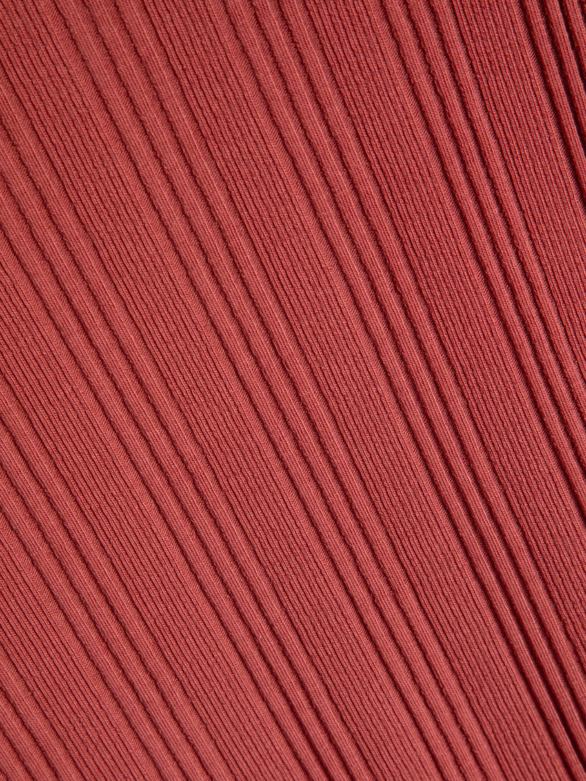 Ribbed finish. Baseball style top stitching. Self fabric binding on neck.