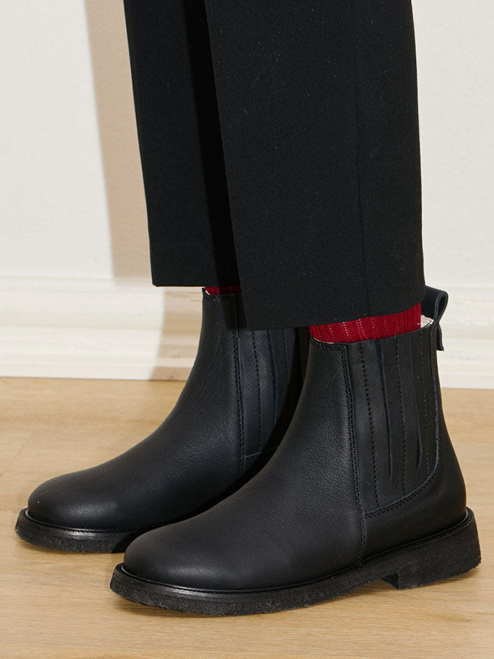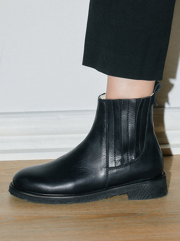 Classic and timeless Black Chelsea Boots from Terhi Pölkki with new black Crepe sole. Beautiful rounded silhouette and elastic side panels covered with leather help to adjust the shaft width. Natural crepe is an excellent sole material for Autumn and Winter. Upper: Chrome free wet white tanned leather Lining: Chrome free wet white tanned leather Sole: Natural crepe Designed in Helsinki Handcrafted in Portugal