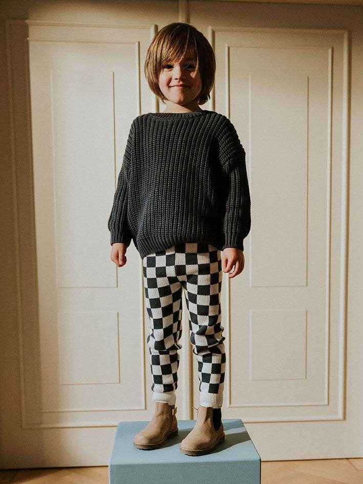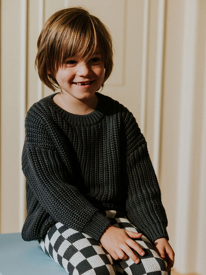 Crafted from 100% organic cotton, this Chunky Knitted Sweater Charcoal from Yuki Kidswear is both sustainable and stylish. Made with GOTS and OEKO-TEX® certified yarns, it offers a soft, breathable feel while meeting the highest standards in eco-conscious production.