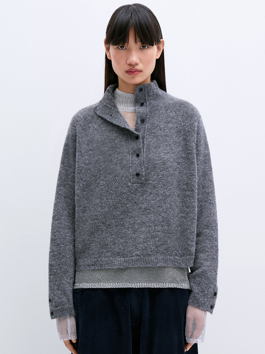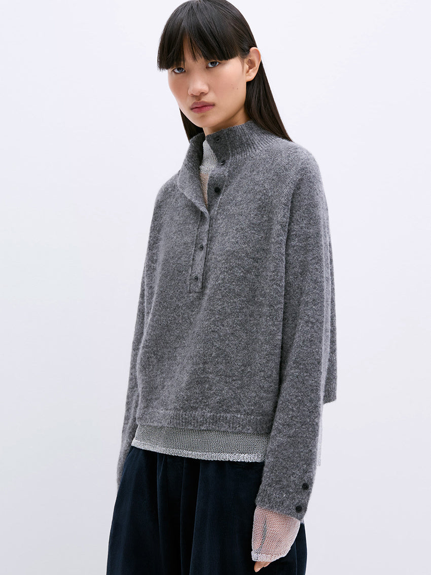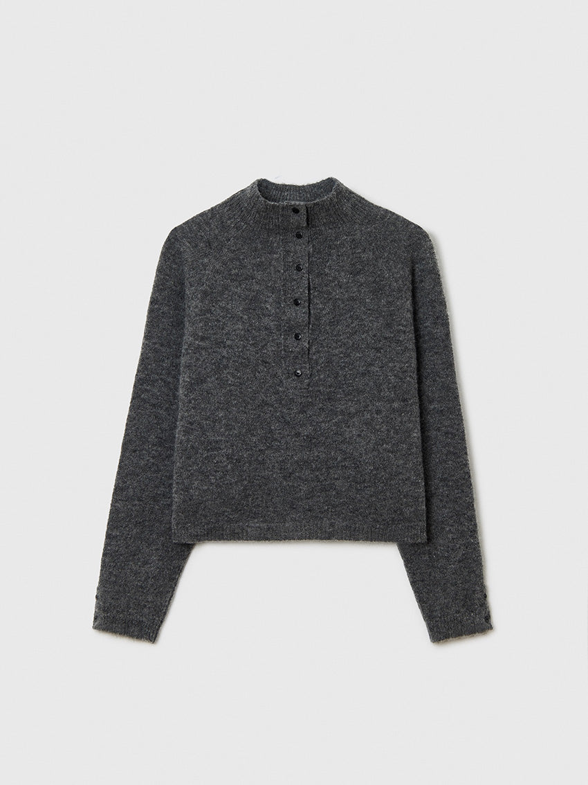 Details include polo neck with buttons and long sleeves with two buttons on the cuffs.