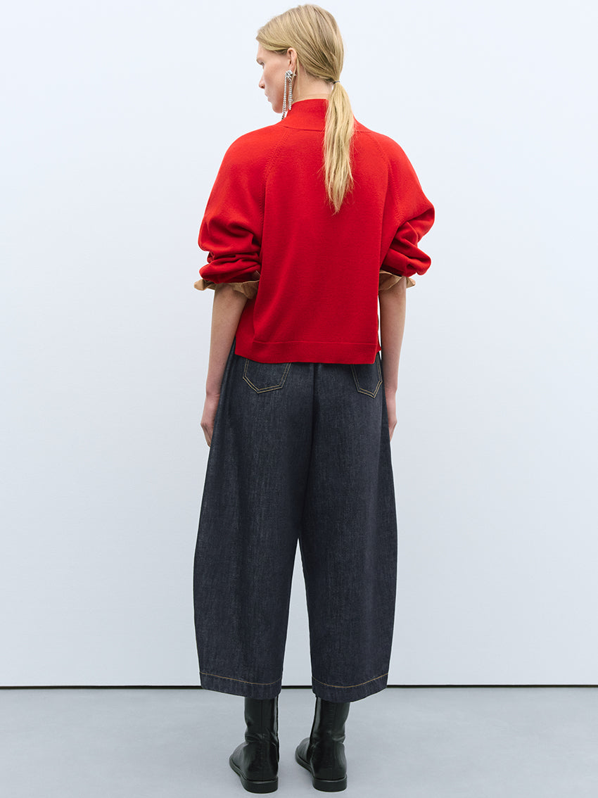 A vibrant red cardigan with a bold yet minimalist appeal.