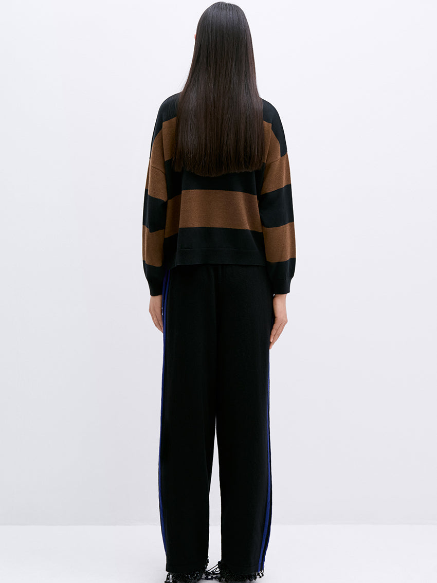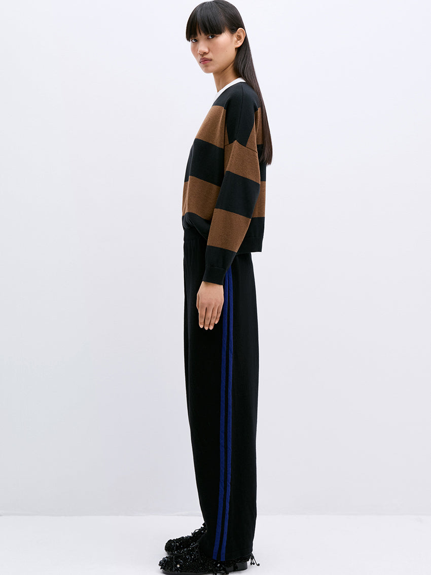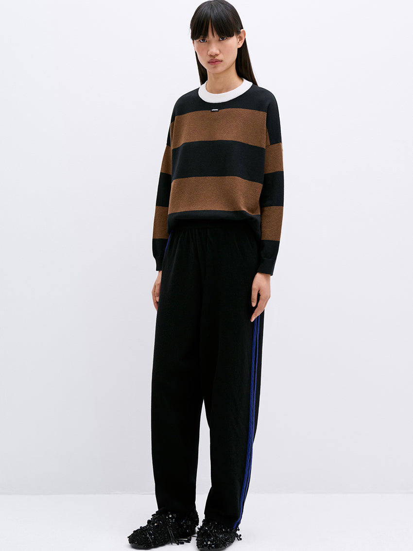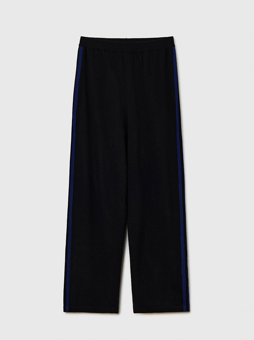 A flattering and comfy shape with elasticated waistband framed by rib trims on the waist and bottom and two contrasting blue side stripes.