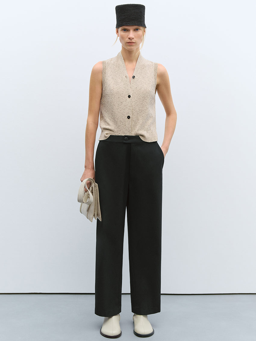 Designed for comfort and crafted from high-quality materials, they feature an elasticated waistband at the back, a concealed zip with a flap, side pockets and a button closure.