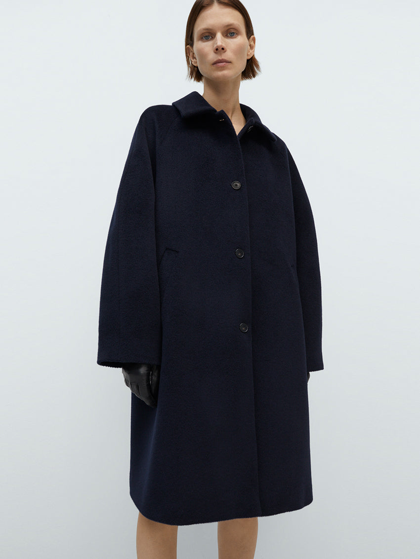 The Cordera Single Breasted Wool Coat in Navy is a classic everyday coat with a mid-length cut and an oversized fit, making it a comfortable wardrobe staple.