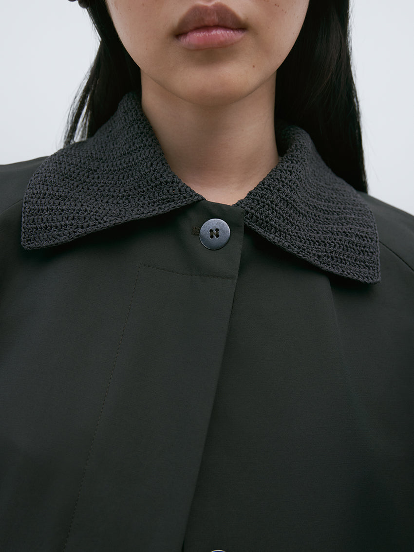 The tone-on- tone crochet pointy collar makes this garment very special for your timeless closet.