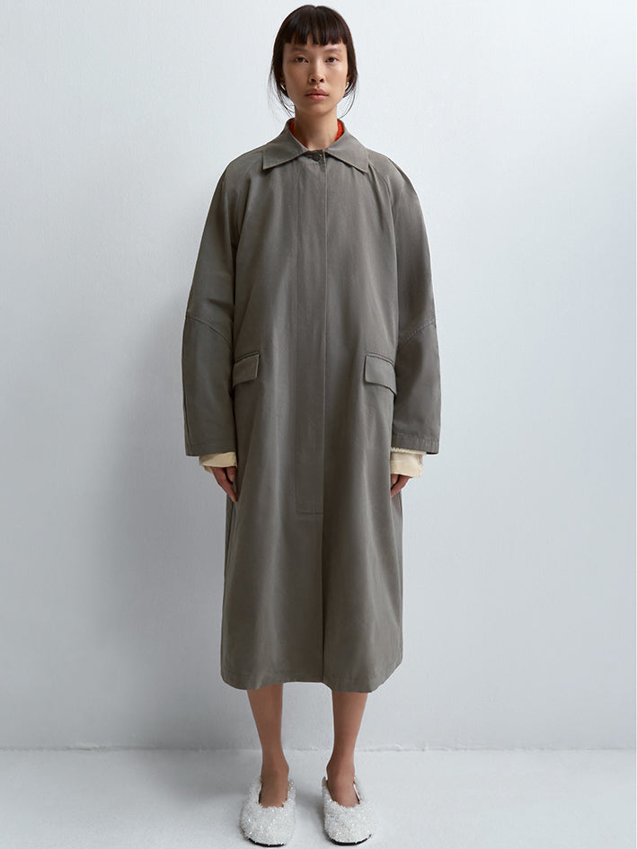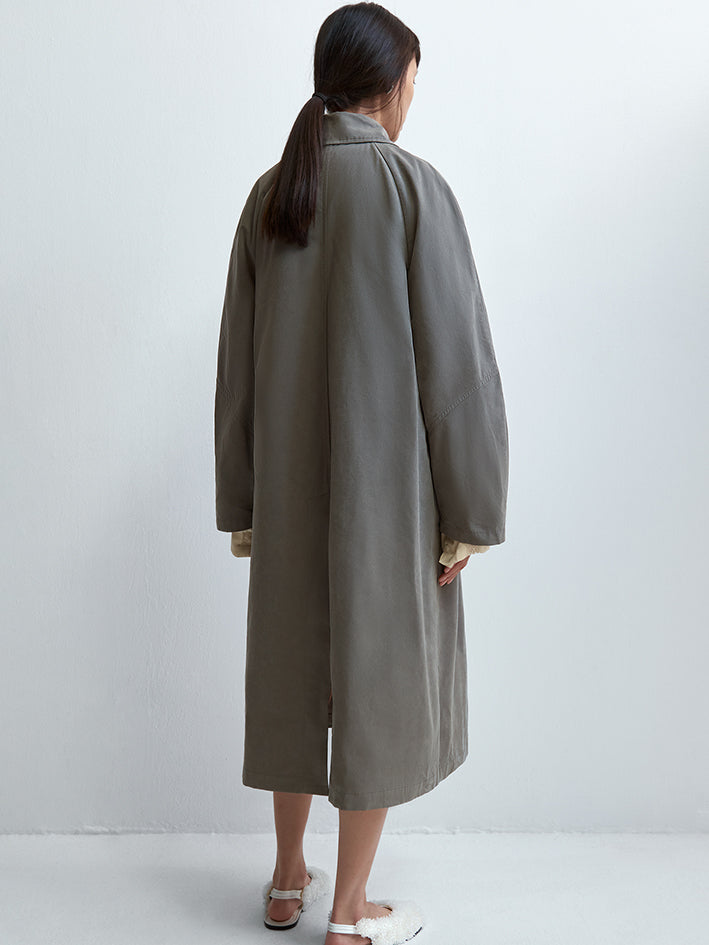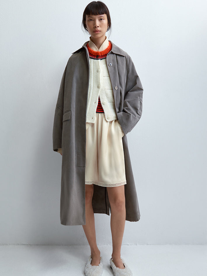 The Cordera Wax Cotton Trench in Taupe Grey is a unique and special rainy trench coat that is light and water repellent.