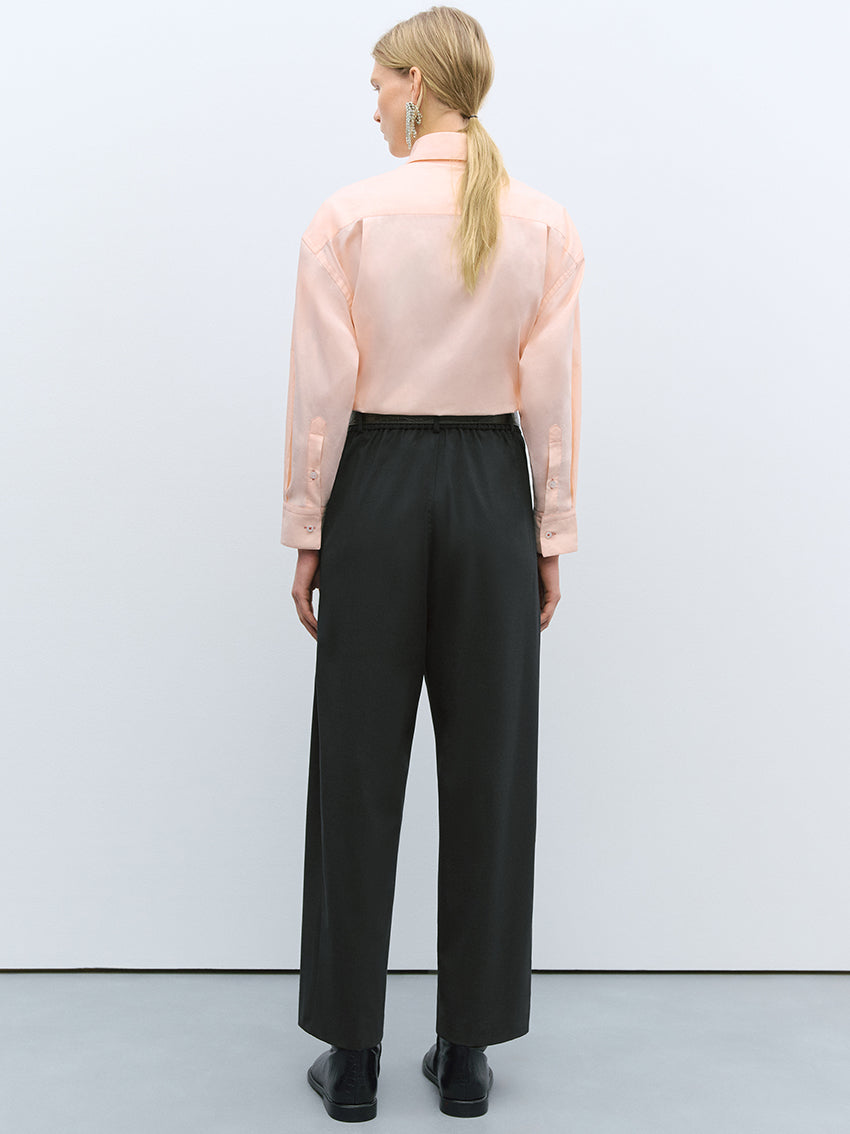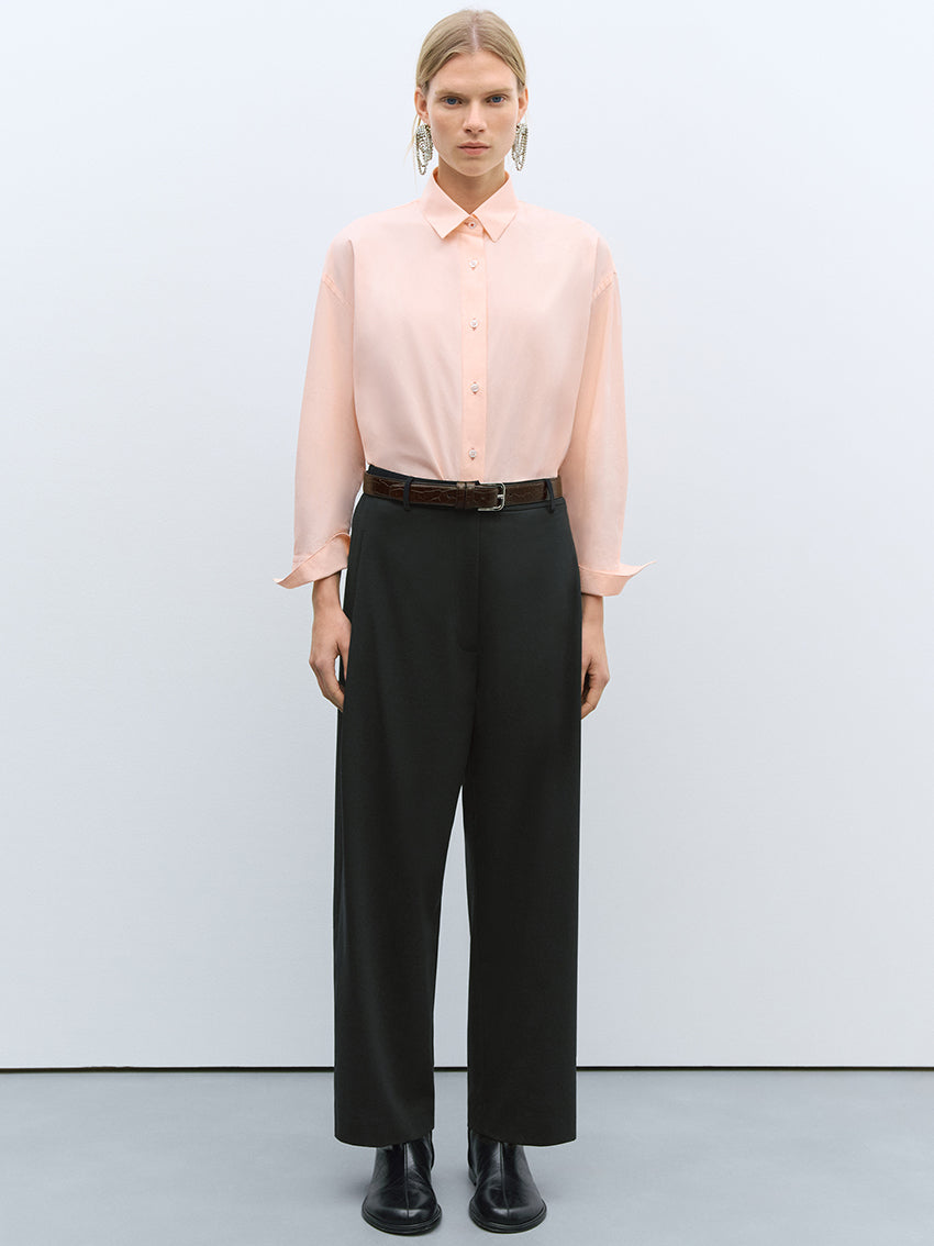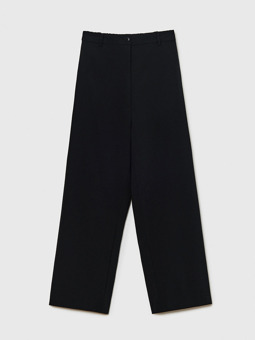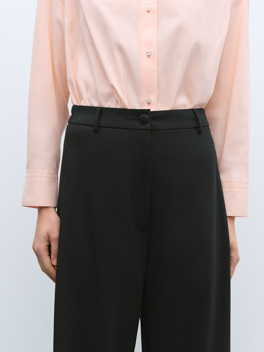 This is a wide leg style detailed with side pockets, belt loops, side pleats and zipper closure finished with tone-on-tone button for a sleek finish.