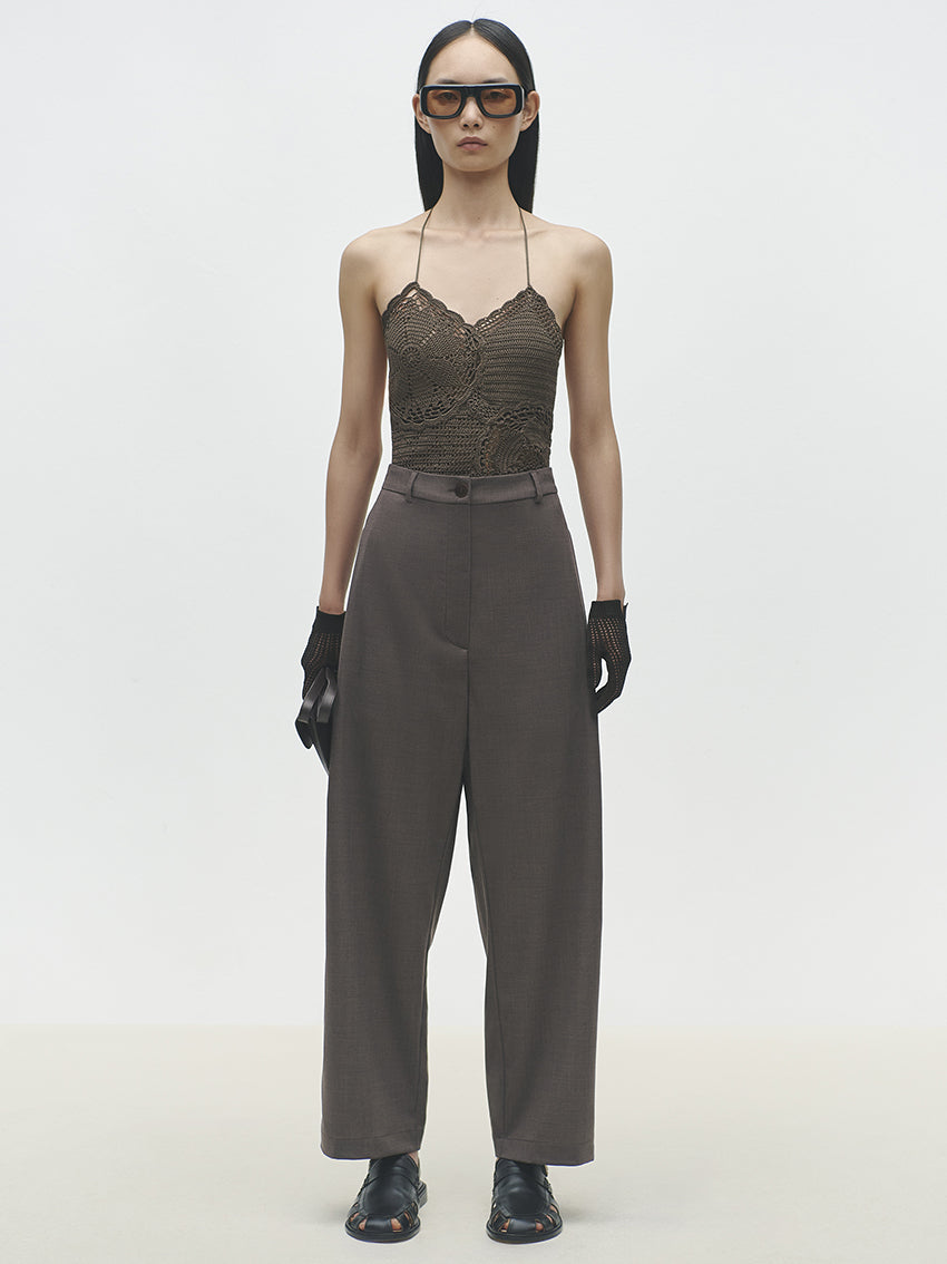 This wide-leg style features side pockets, belt loops, and side pleats.