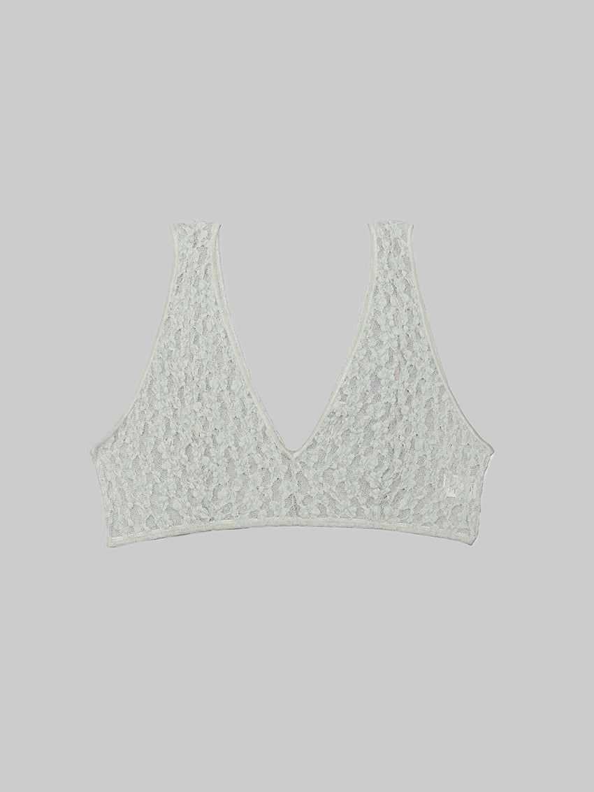 Organic cotton lace bra with V-neck, exposed seams and elastic trim at neckline and hem.