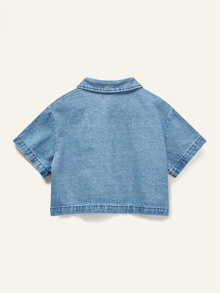 Made from soft, durable Denim Mid Bleach Wash , this Crop Day Shirt by Wynken features a classic collar and button-down opening for a timeless look with a fun twist. The cropped fit adds a trendy edge, while the chest pocket with our friendly Wynken logo embroidery bring a touch of practicality and style. Perfect for pairing with high-waisted shorts or skirts, this shirt is ideal for sunny days, family outings, or just hanging out with friends.