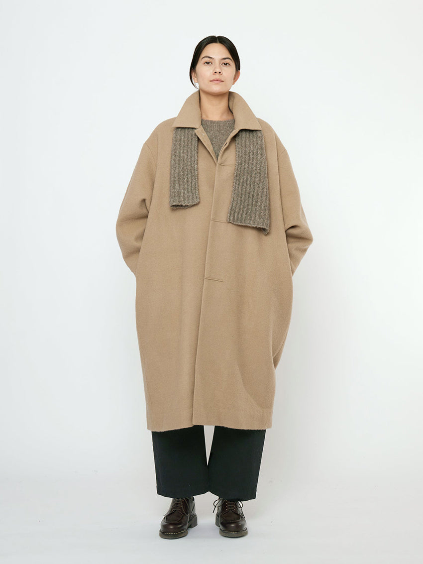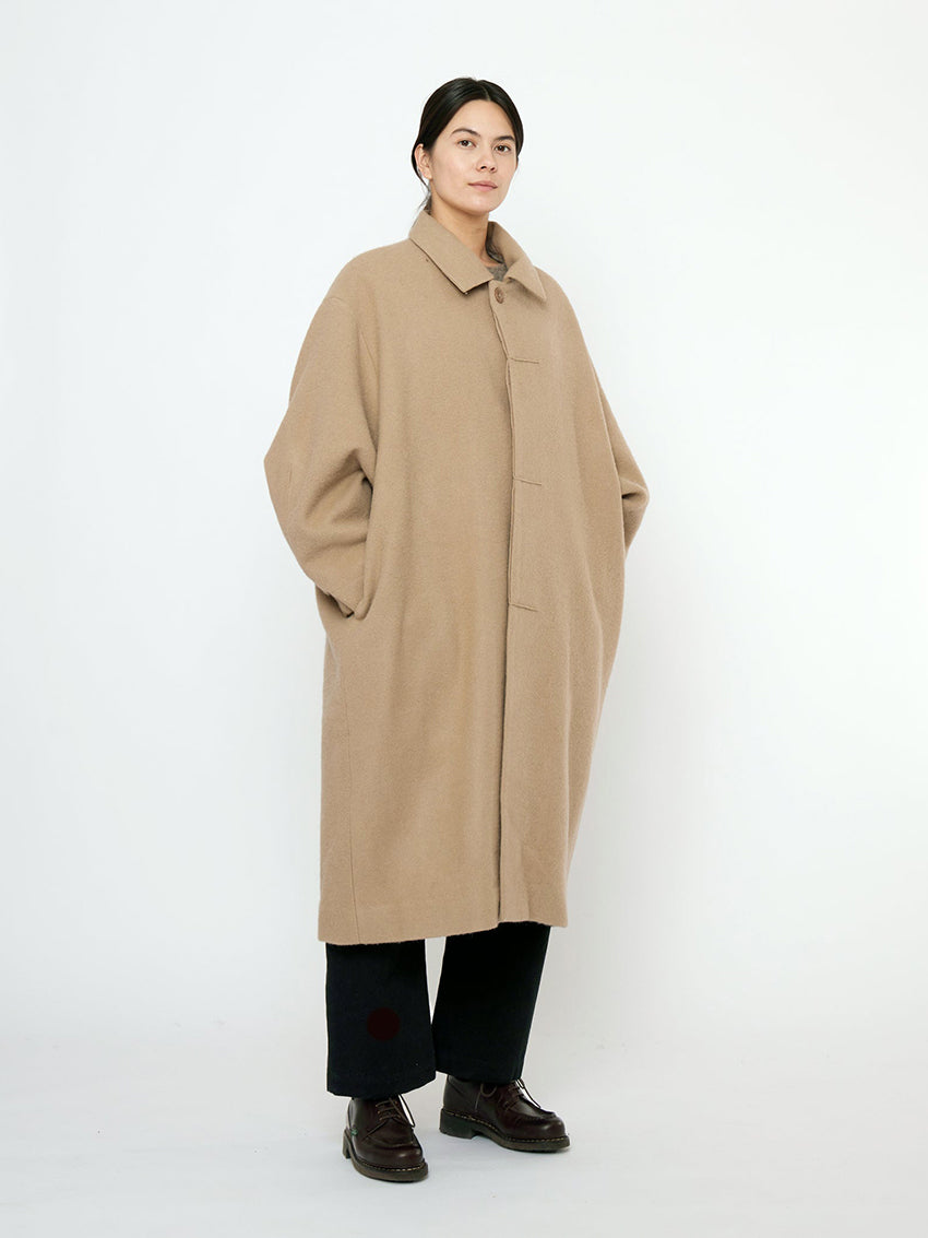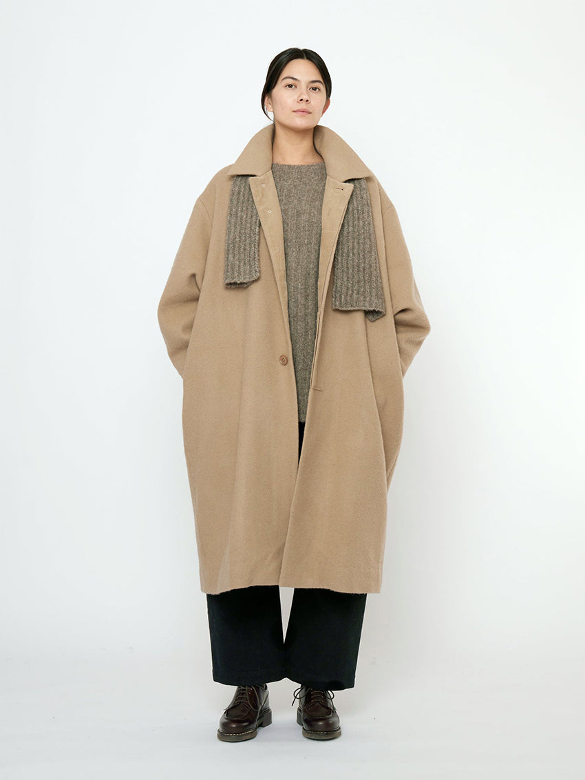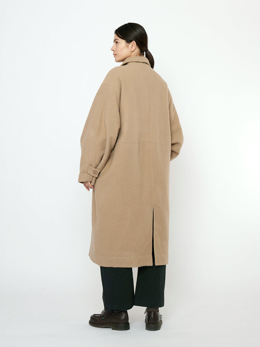 A mid-length coat cut in a boxy cocoon silhouette for comfortable layering.