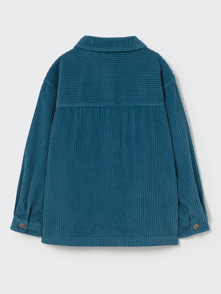 Super soft and cozy wide Corduroy Shirt in Blue Midnight by My Little Cozmo made from OCS and OEKO-TEX certified organic cotton. It features a collar with contrasting corduroy fabric on the inside, metallic buttons at the front, two chest patch pockets in contrasting corduroy, cuffs lined with ‘Cozmo’ fabric, and a back yoke. Gentle to the touch and pleasantly snug. Made from Organic Content Standard (OCS) and GOTS-certified organic cotton. Provides natural insulation to keep them warm and cozy. Gentle texture, ideal for sensitive skin. Structured yet flexible for a snug, comfy fit. Gentle on the skin and the planet. A sustainable choice for your kid’s wardrobe. 100% organic cotton. Woven