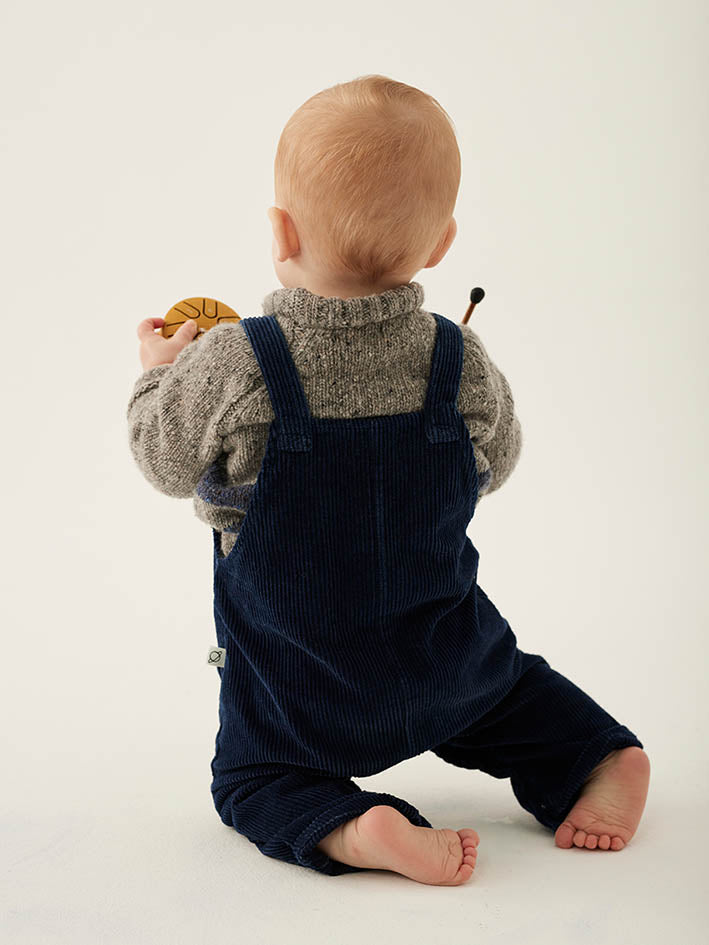 Super soft and cozy wide Dax Corduroy Overalls in Navy Denim by My Little Cozmo made from OCS and OEKO-TEX certified organic cotton. It features a straight neckline and adjustable front straps with buttons. The design includes a central seam, two patch pockets at the front, and snap buttons along the legs for easy dressing. Details in contrasting corduroy fabrics add subtle texture. Lined with signature ‘Cozmo’ fabric, it’s gentle to the touch and pleasantly snug—ideal for babies. Provides natural insulation to keep the baby warm and cozy. Gentle texture, ideal for sensitive skin. Structured yet flexible for a snug, comfy fit. Gentle on the skin and the planet. A sustainable choice for your baby’s wardrobe. 100% organic cotton. Woven