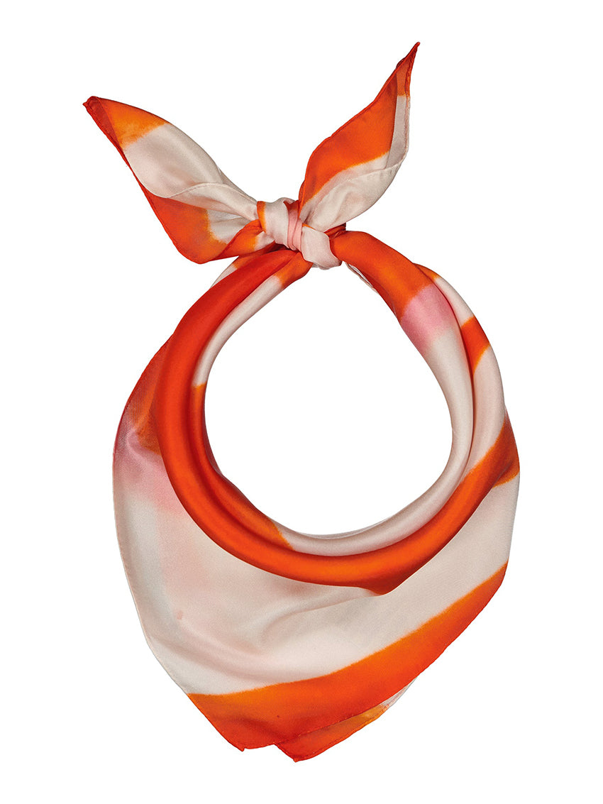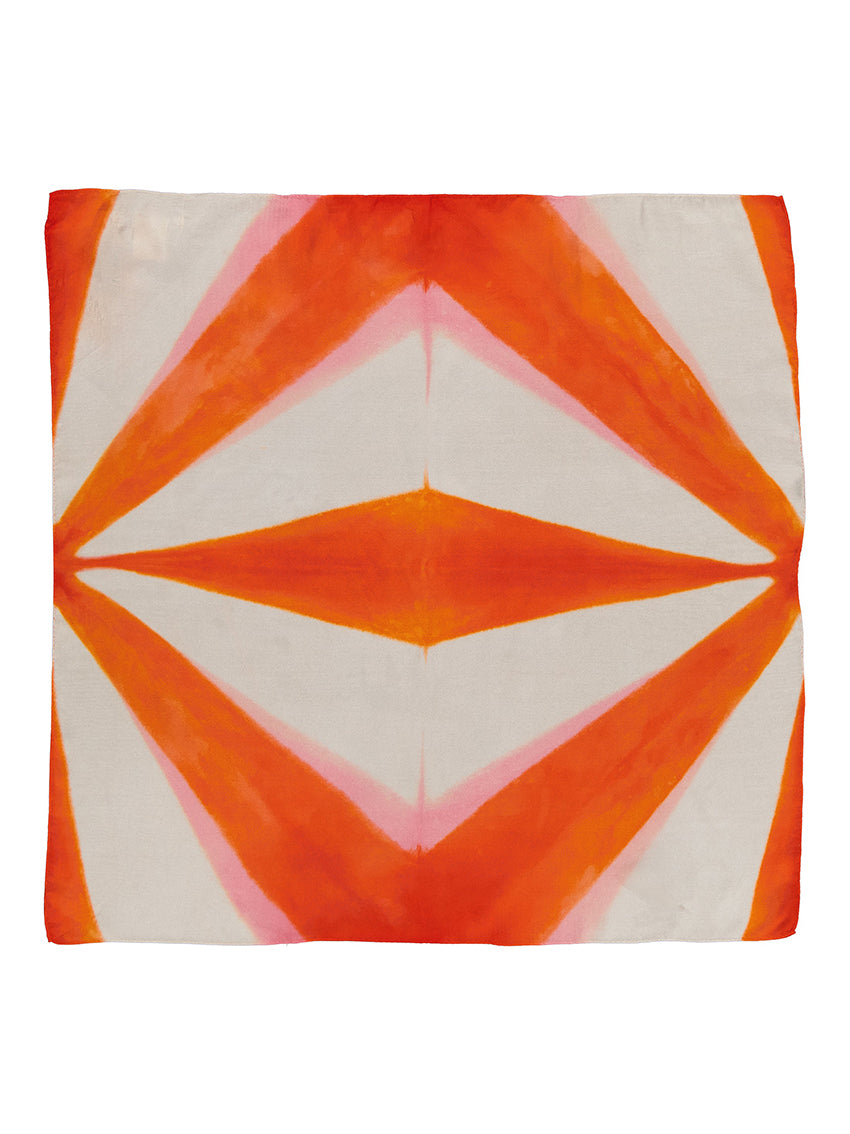 The Denovebre "Mirage" is a hand dyed and graphic silk bandana, with kaleidoscopic pattern and vibrant colors made by using an artisanal dyeing process.