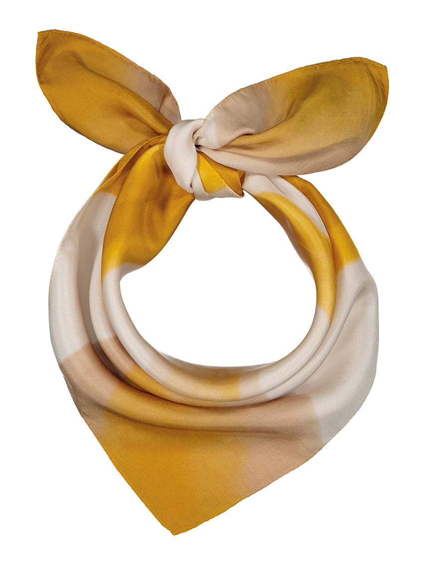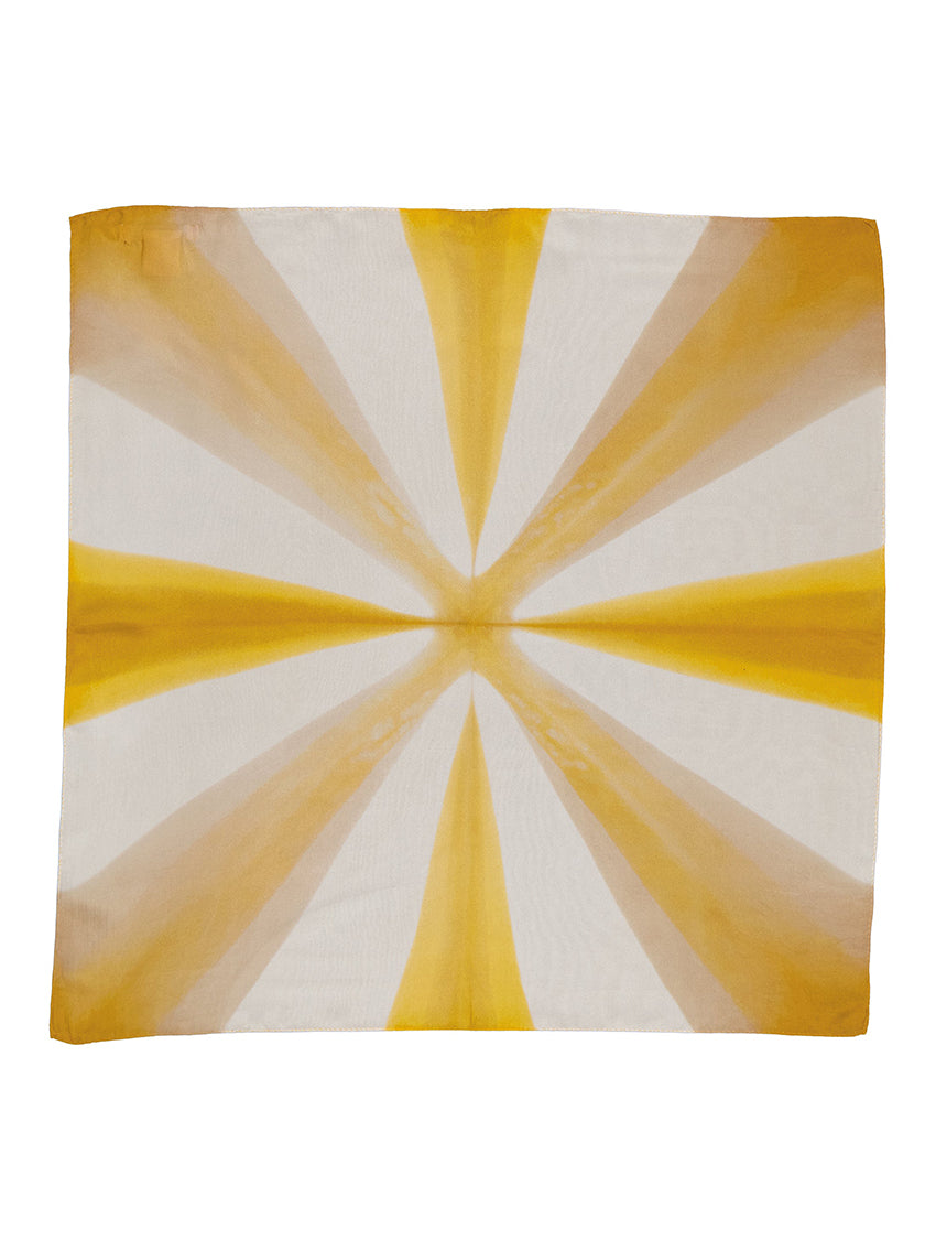 The Denovebre "Mirage" is a hand dyed and graphic silk bandana, with kaleidoscopic pattern and vibrant colors made by using an artisanal dyeing process.