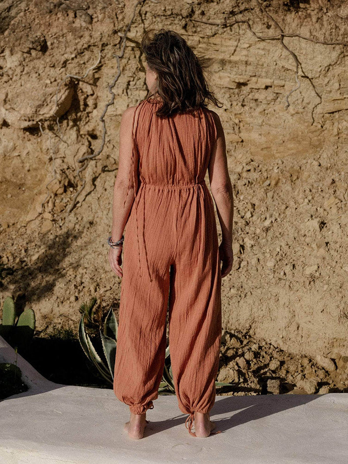 Linen cotton Diph Jumpsuit in Brick from Baserange Boat neck Ties at neck and hem Elasticated gathers at waist Worn multiple ways 74% Linen 26% Organic Cotton Made in Turkey Model wears a size S