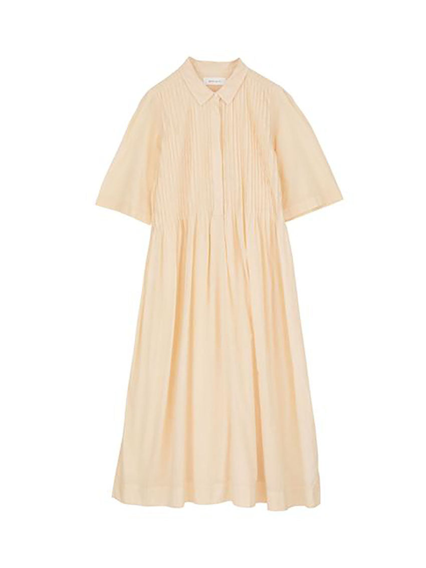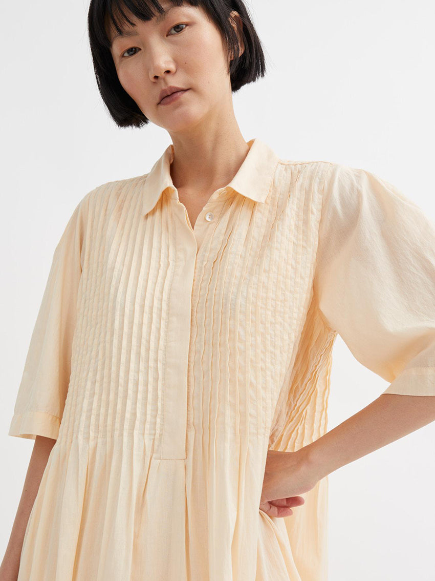 The dress features pleats, a shirt collar with mother of pearl buttons, long t-shirt sleeves, and volume in the skirt.