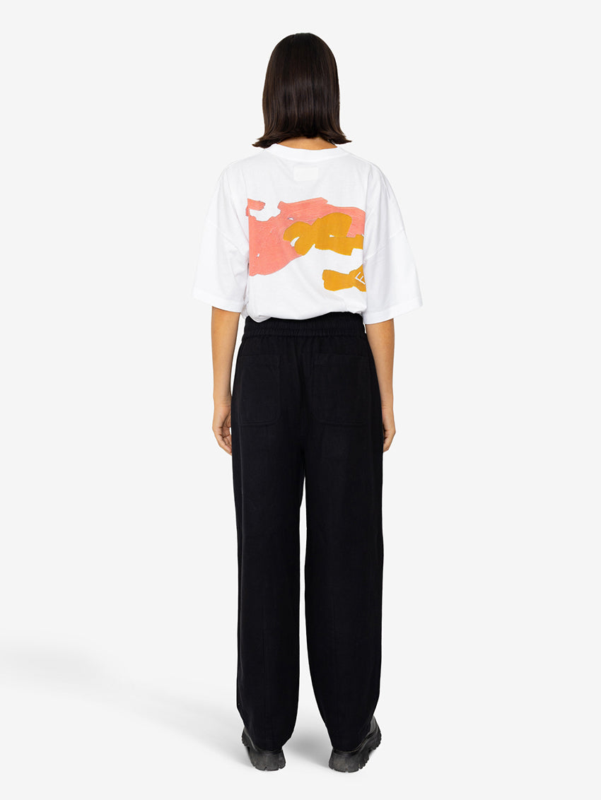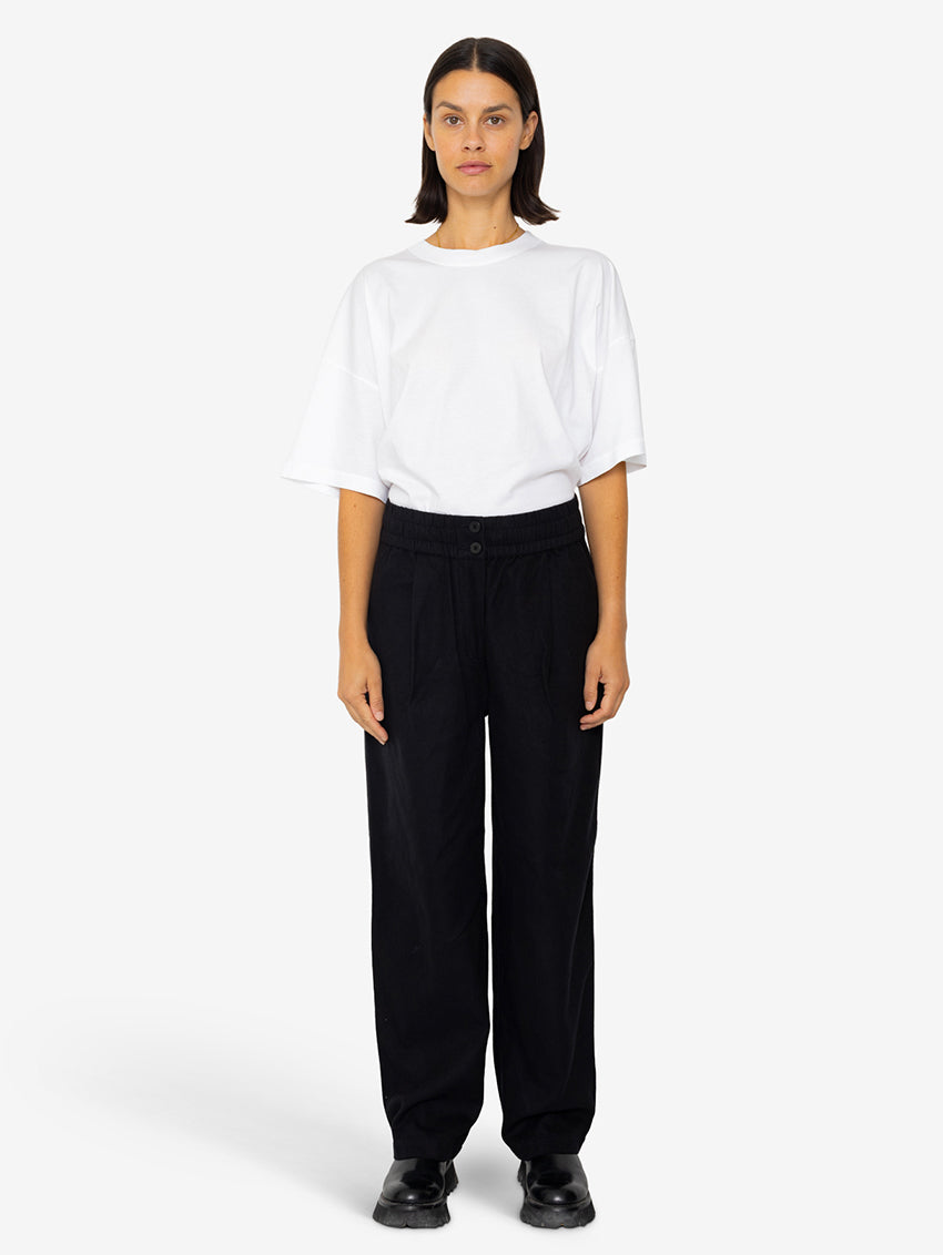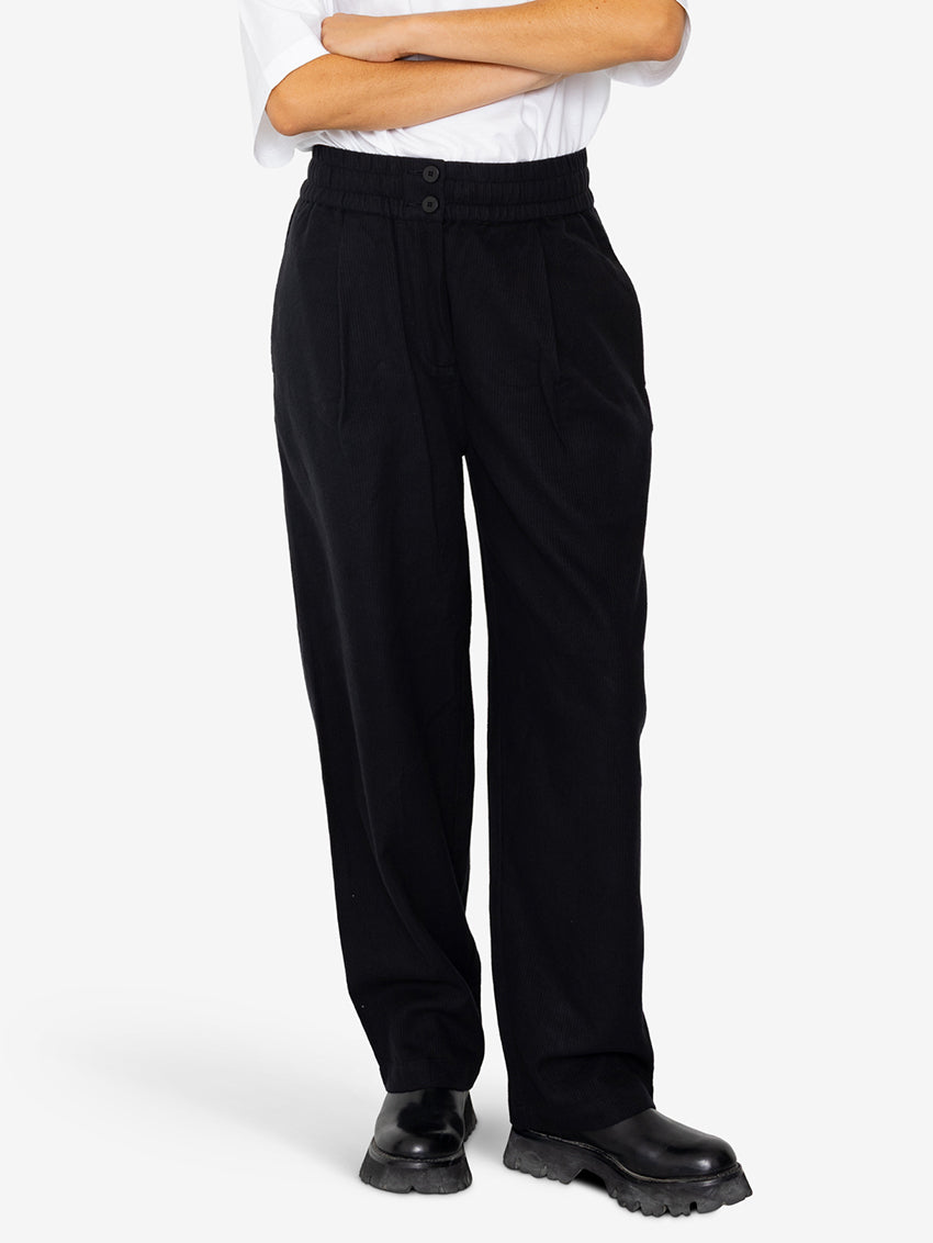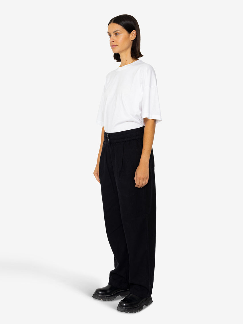 The Folk Drawcord Baggy Pants in Soft Black Brushed Stripe are loose fitting, casual trousers with elasticated waistband; finished with two front button fastenings.