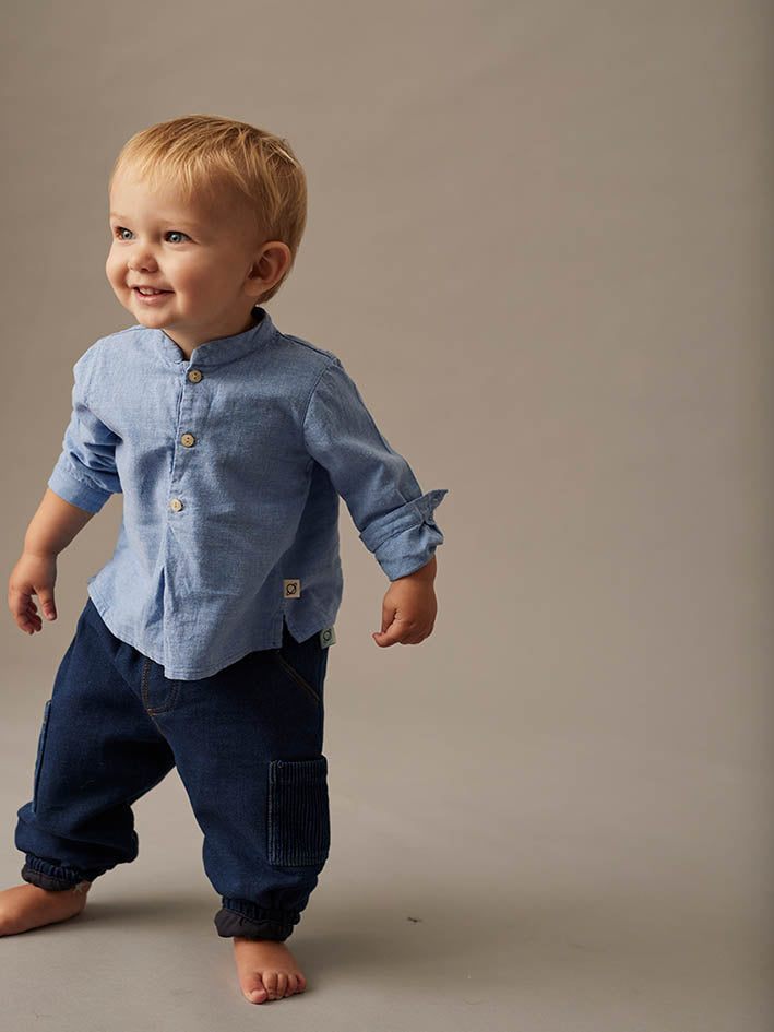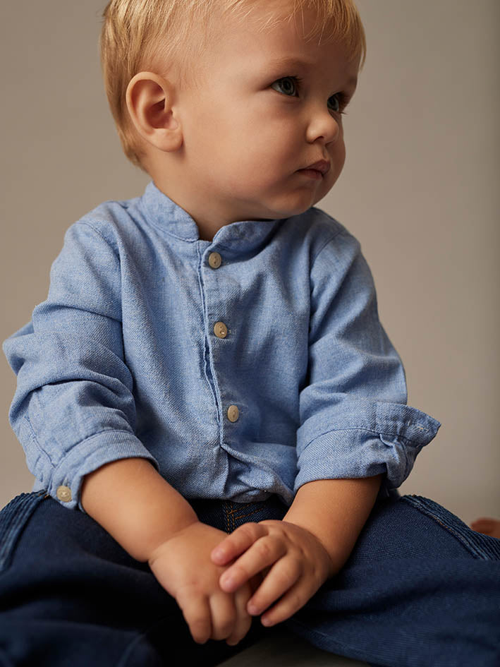 This Dublin Chambray Baby Shirt by My Little Cozmo is made from cotton Flannel with a mélange effect, crafted from 100% sustainable cotton. It features a classic collar, a button-down front placket, and a chest patch pocket with “Cozmo” embroidered on it. Buttoned cuffs offer a secure fit. Fully lined with a soft brushed knit for added warmth and comfort. Made from cotton certified by the Better Cotton Initiative. Offers a unique, handcrafted look. A sustainable choice for your baby’s wardrobe. 100% cotton. Woven