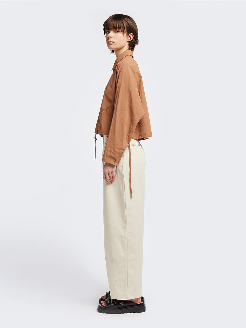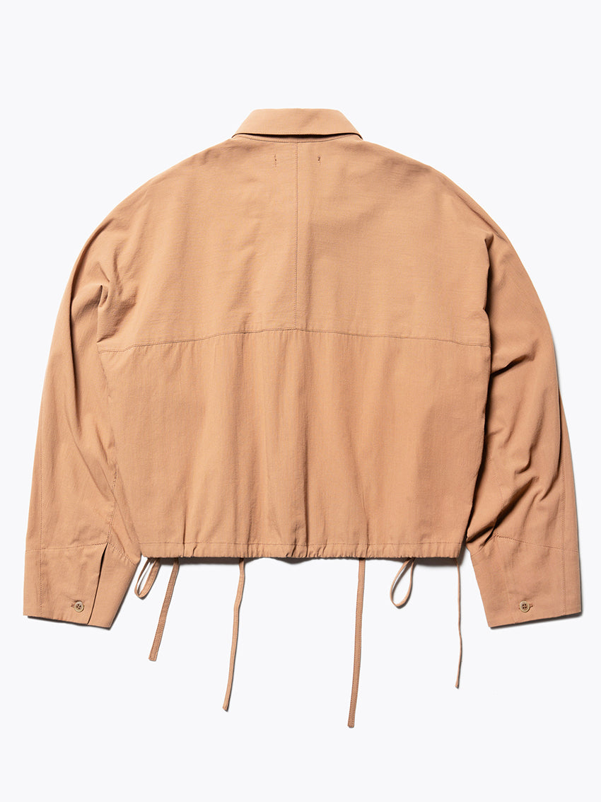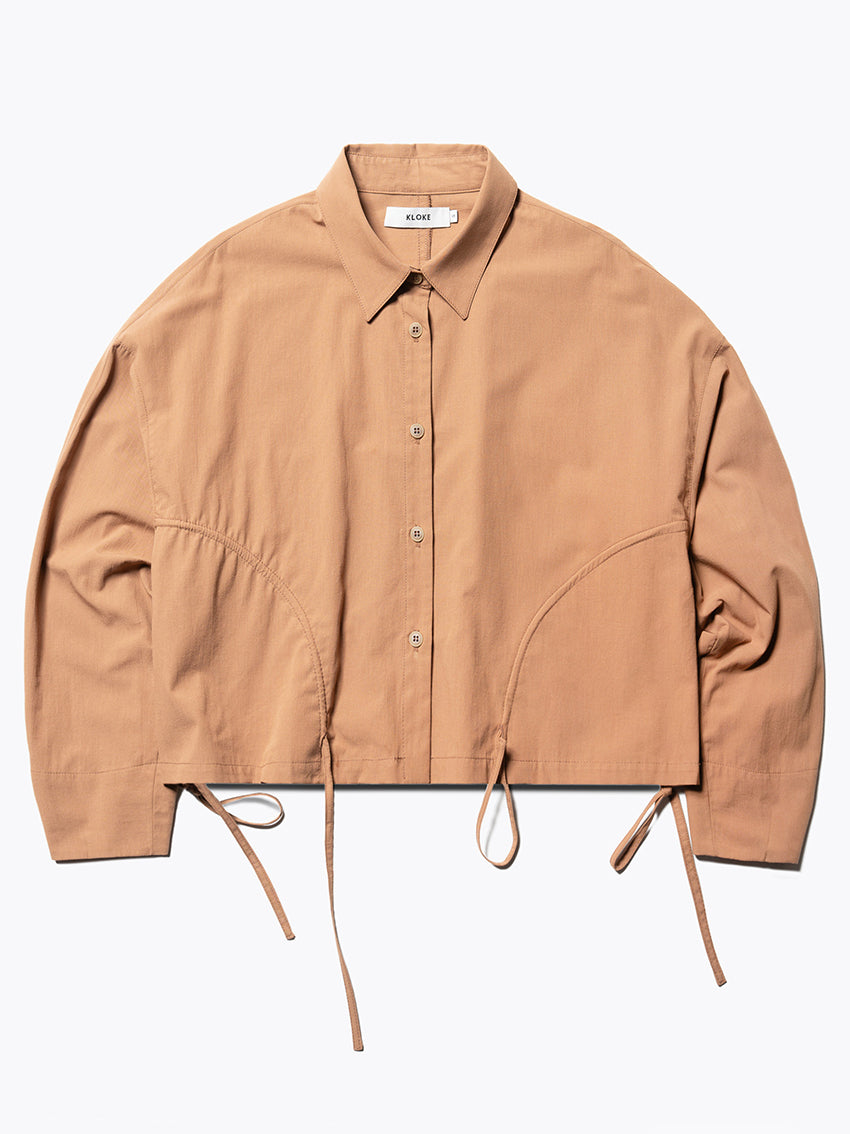 A Cropped long sleeve style Shirt in Toffee Brown by Kloke that can easily be worn as an alternative to a summer jacket. This style features pull through tie channels at the front and a self-front tie through waist. You can really bring your own sense of style to this piece and wear it in a few varying ways. A simple centre front button closure and in seam pockets are the classic elements found in this style. 55% Cotton, 45% Nylon