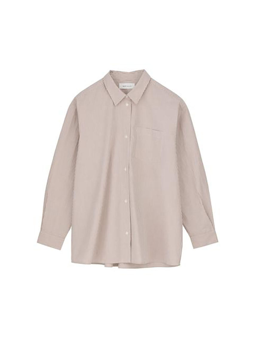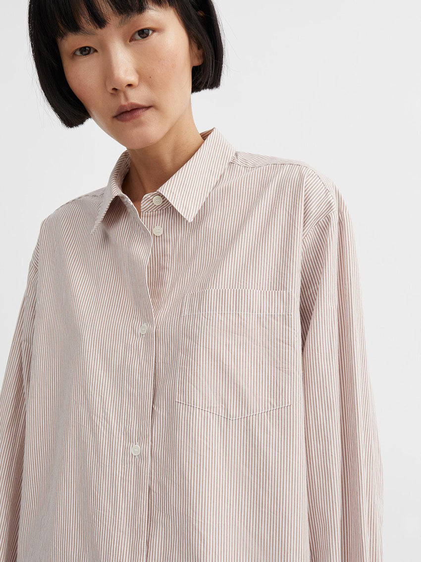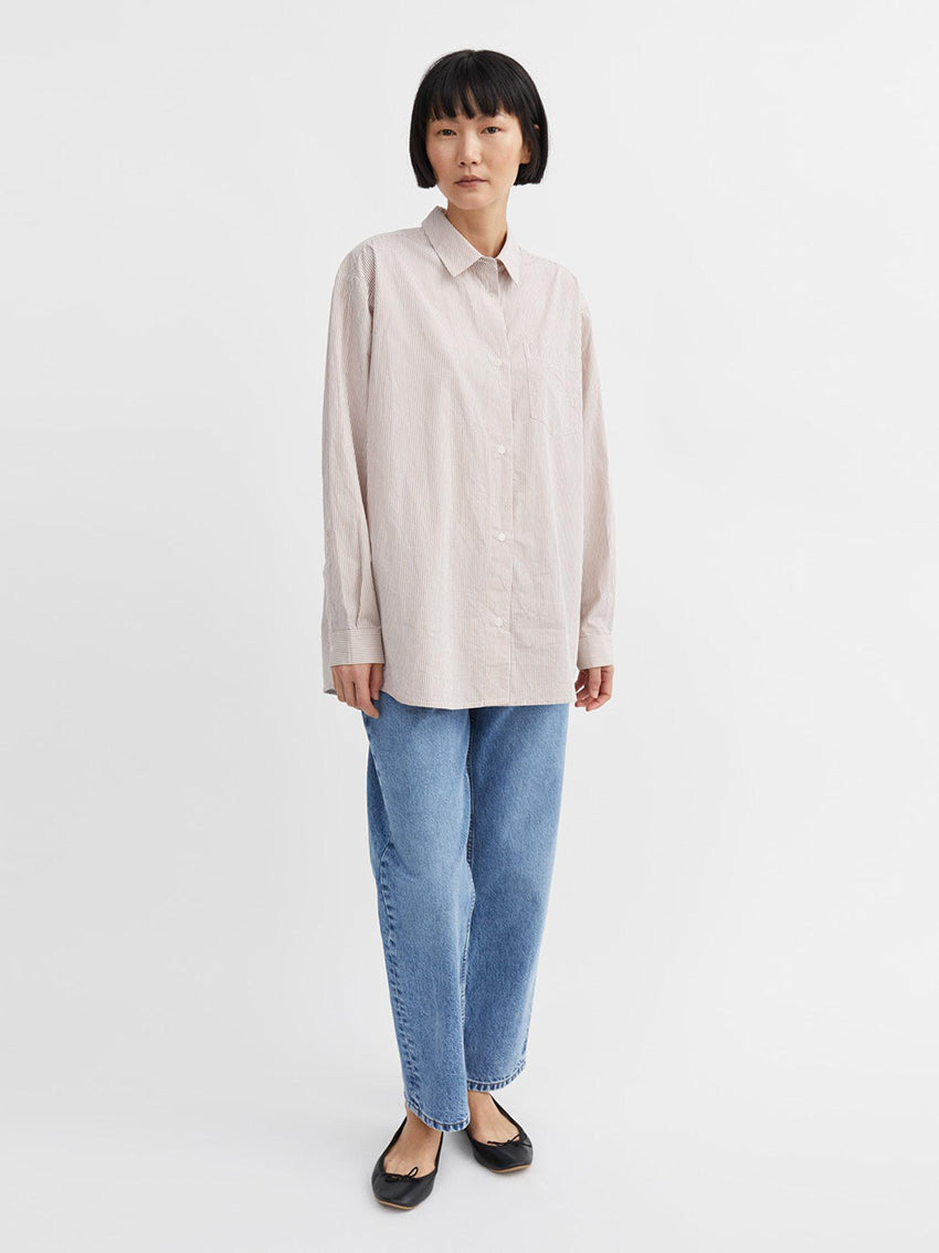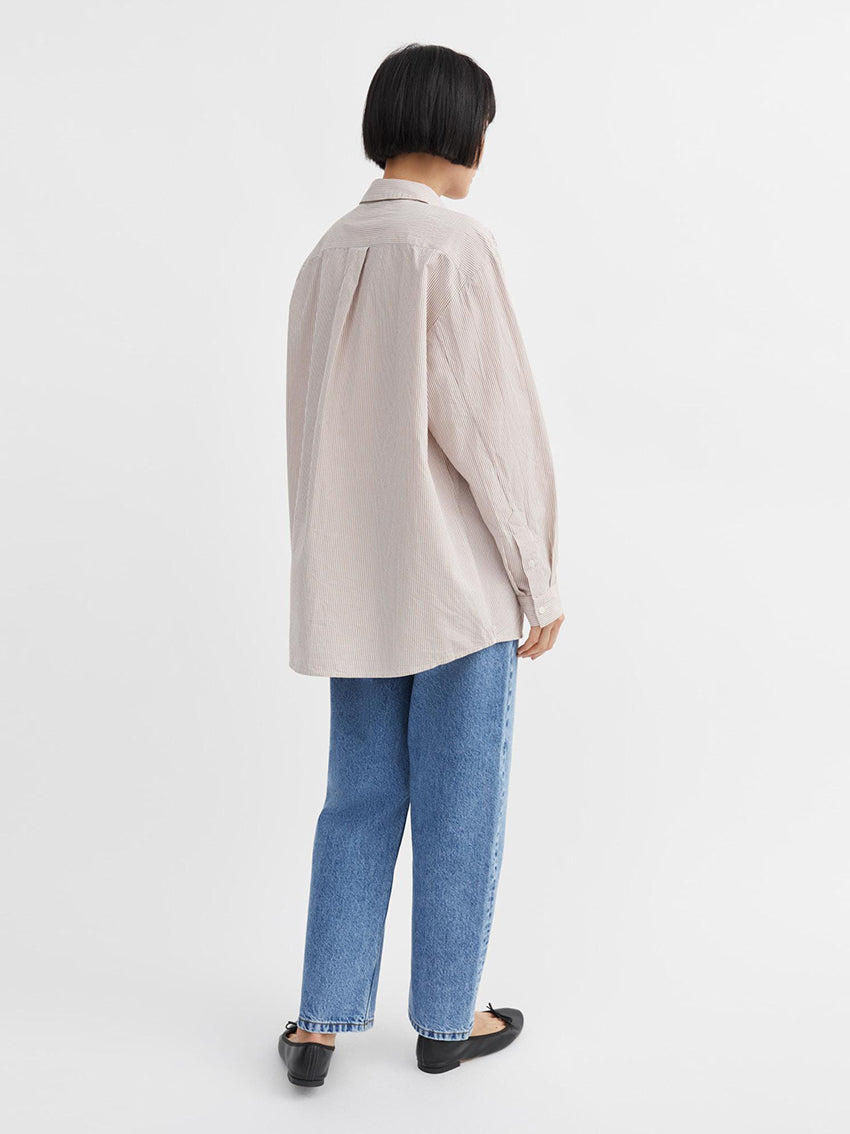 The Skall Studio Edgar Shirt in Warm Beige White Stripe is an oversize menswear inspired shirt crafted from organic cotton poplin. The shirt has a regular collar, long sleeves with buttoned cuffs and a button-down front. It has a chest pocket and a yoke with wide pleats at the back. SIZE RECOMMENDATION Very oversized fit serving that same feel as the shirt we tend to borrow from his side of the closet, or the classic broad-shouldered coat found in a chic vintage shop. Go for your normal size if you love it to be oversize or size down for a more regular look. The model is wearing a size 36. FABRIC AND CARE • 100% organic cotton poplin • GOTS certified • Machine wash at max. 30 degrees • Produced in India