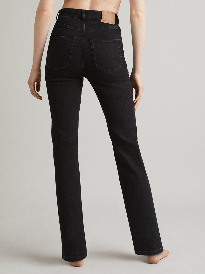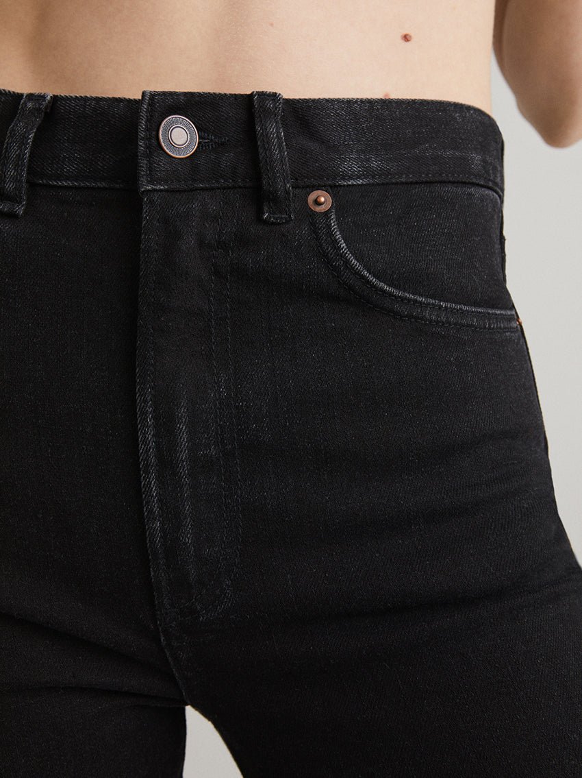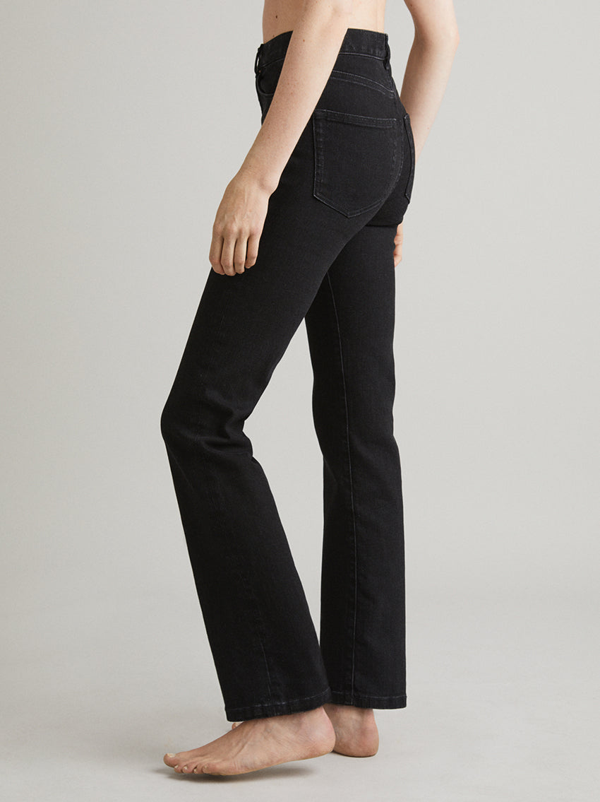 Eiffel is Jeanerica’s trademark high waist silhouette. Features a super high-rise, slim thigh and straight leg from the knee, giving the jeans a slight bootcut. The jeans are primarily made from organic cotton blended with recycled polyester and limited amount of elastane. This special combination developed by Jeanerica gives the garment an effortless stretch that retains the shape over time. Black 2 Weeks is a black over-dyed denim with a light stonewash. Inspired by the slightly used look you get after a few washes.