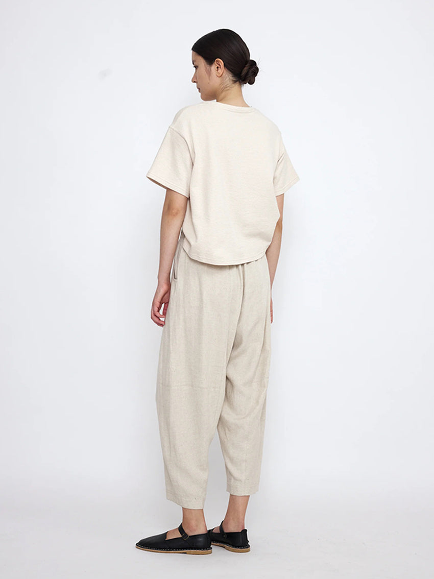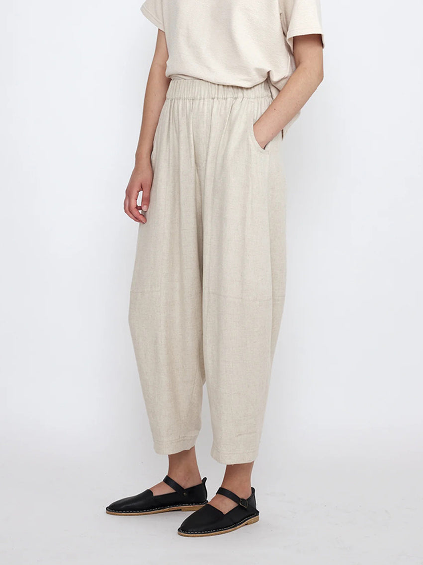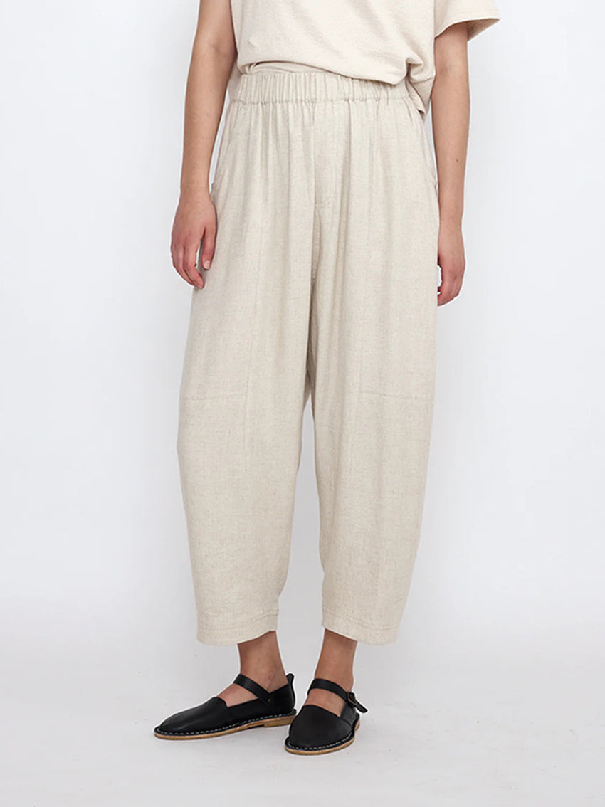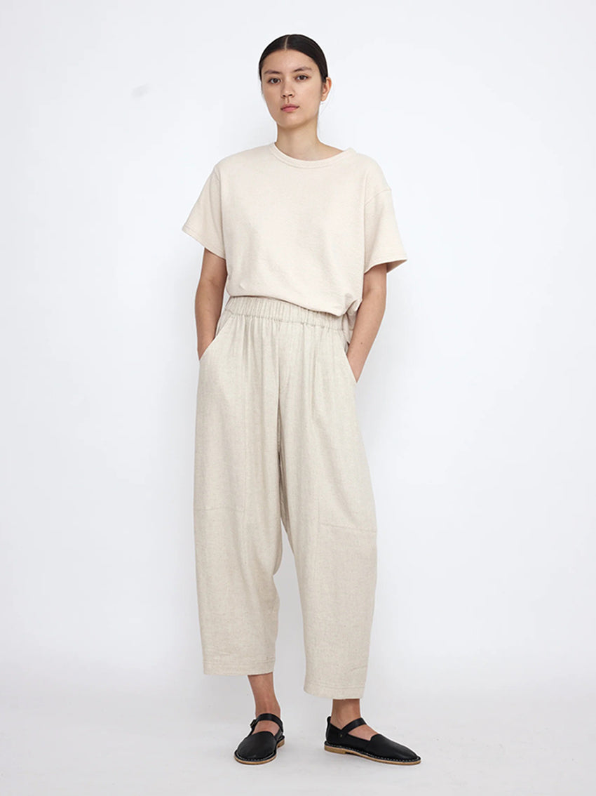 A relaxed Trouser by 7115 By Szeki with an elegant Barrel shape throughout the leg. Features paneled construction, fully elasticated waistband, and slash side pockets. Color: Oatmeal 95% Cotton, 5% Rayon Julie is 5’9” and wearing a XS This cotton-rayon blend is a soft, denim-like fabric with a sand-washed finish for a faded, lived-in look. It’s a mid-weight material that holds a gentle structure. Comfortable, durable, and breathable.