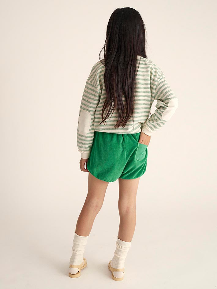 Transform playtime into a fluffy adventure with the Elio Organic Toweling Shorts in Grass Green by My Little Cozmo! Shorts for kids in fluffy and cozy organic cotton toweling. Elastic waistband with decorative drawstring. Contrasting patch pocket at the back with a plush fabric. 85% ORGANIC COTTON, 15% RECYCLED POLYESTER .KNIT