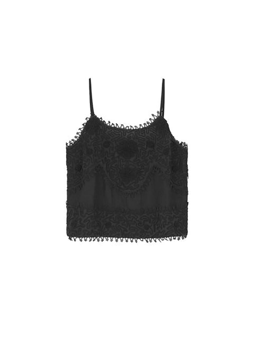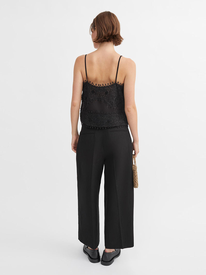 The Emmy Top is a linen strap top with exclusive tape embroidery and lace details.