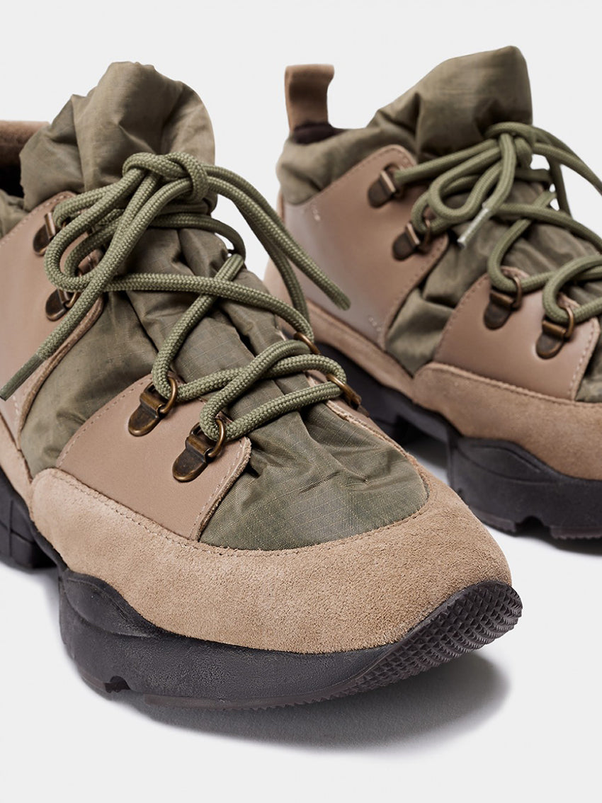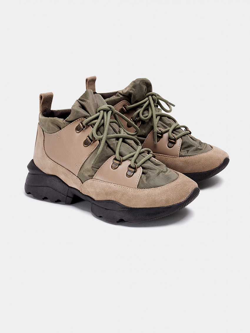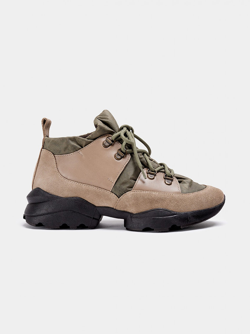 The ERSA by Naguisa in Taupe is a Sporty Ankle Boot. Uppers made of water-resistant recycled polyester, cowhide leather and waterproof-treated split suede. The shaft opens in a bag effect, perfect for all foot types. Matching laces in the same color. Thick TR rubber sole. Fabric lining. Sole height of 4 cm for enhanced back comfort.